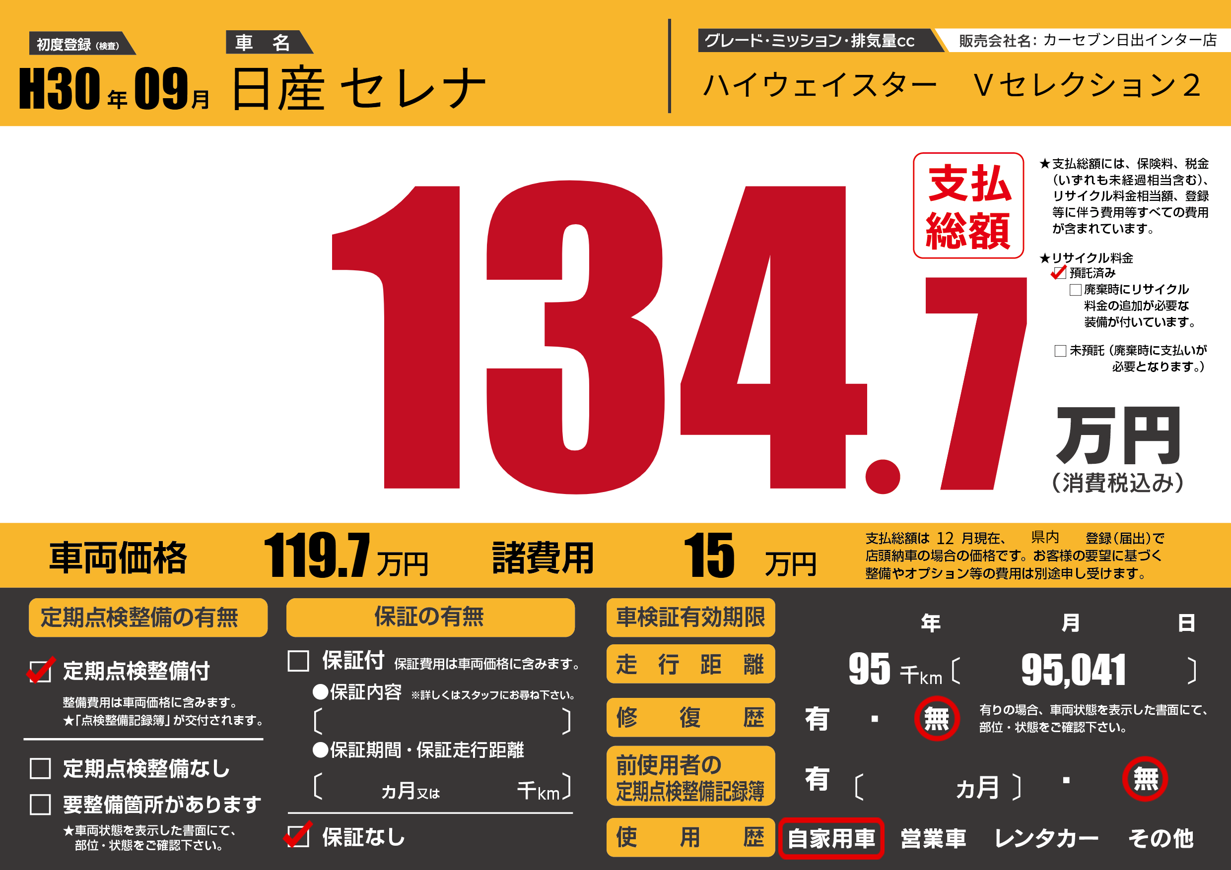 | 車名 | 日産 セレナ | グレード ミッション 排気量 |