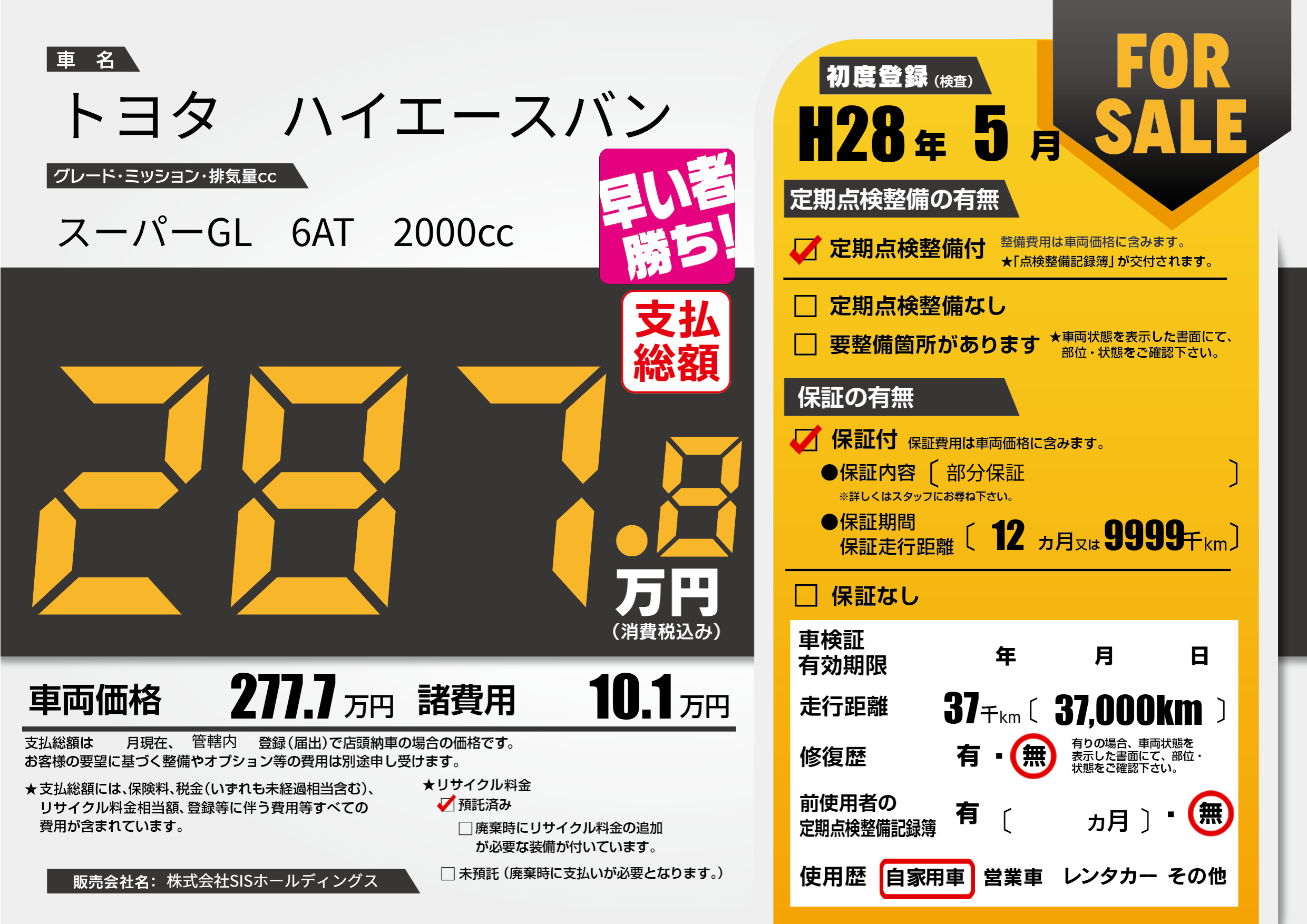 | 車名 | トヨタ ハイエースバン | グレード ミッション 排気量 |