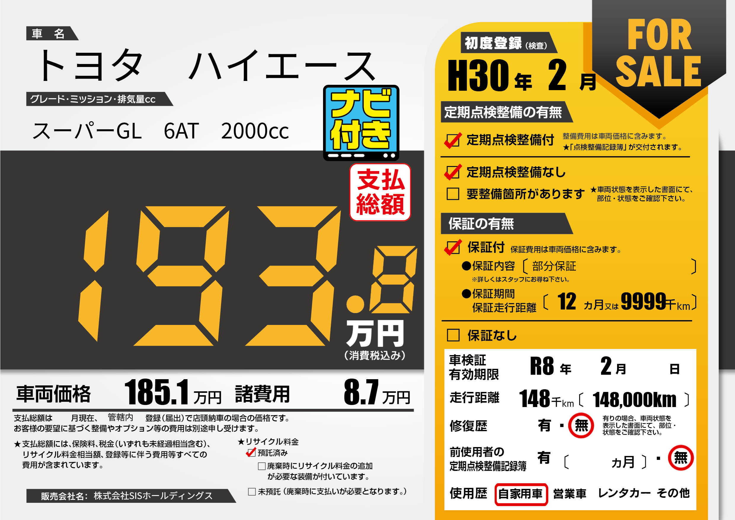 | 走行キロ | 14.8万km | 初年度登録 | H30年2月 |