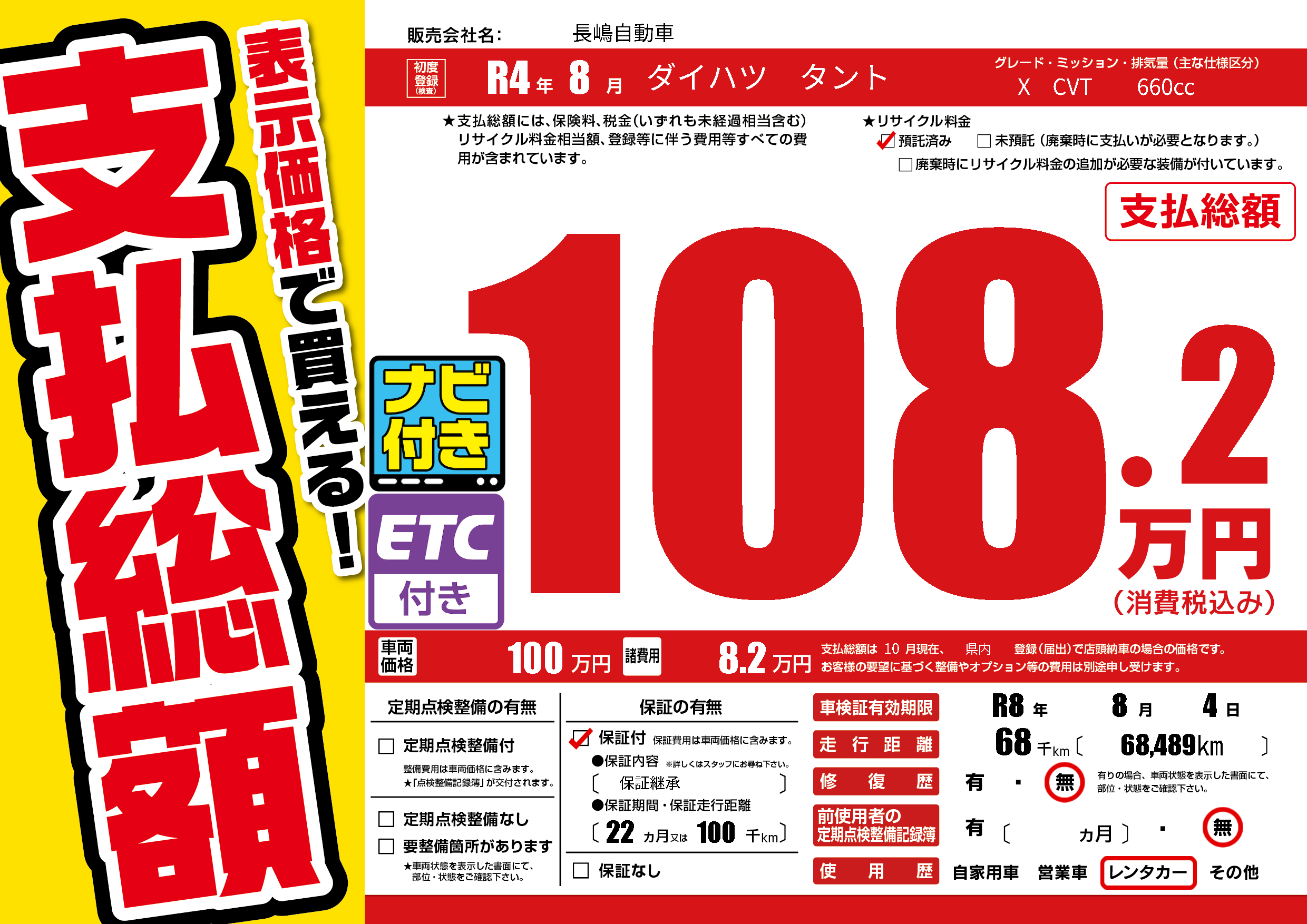 保証付き 保証内容( 保証継承) 22ヶ月または(100)千kmまで |