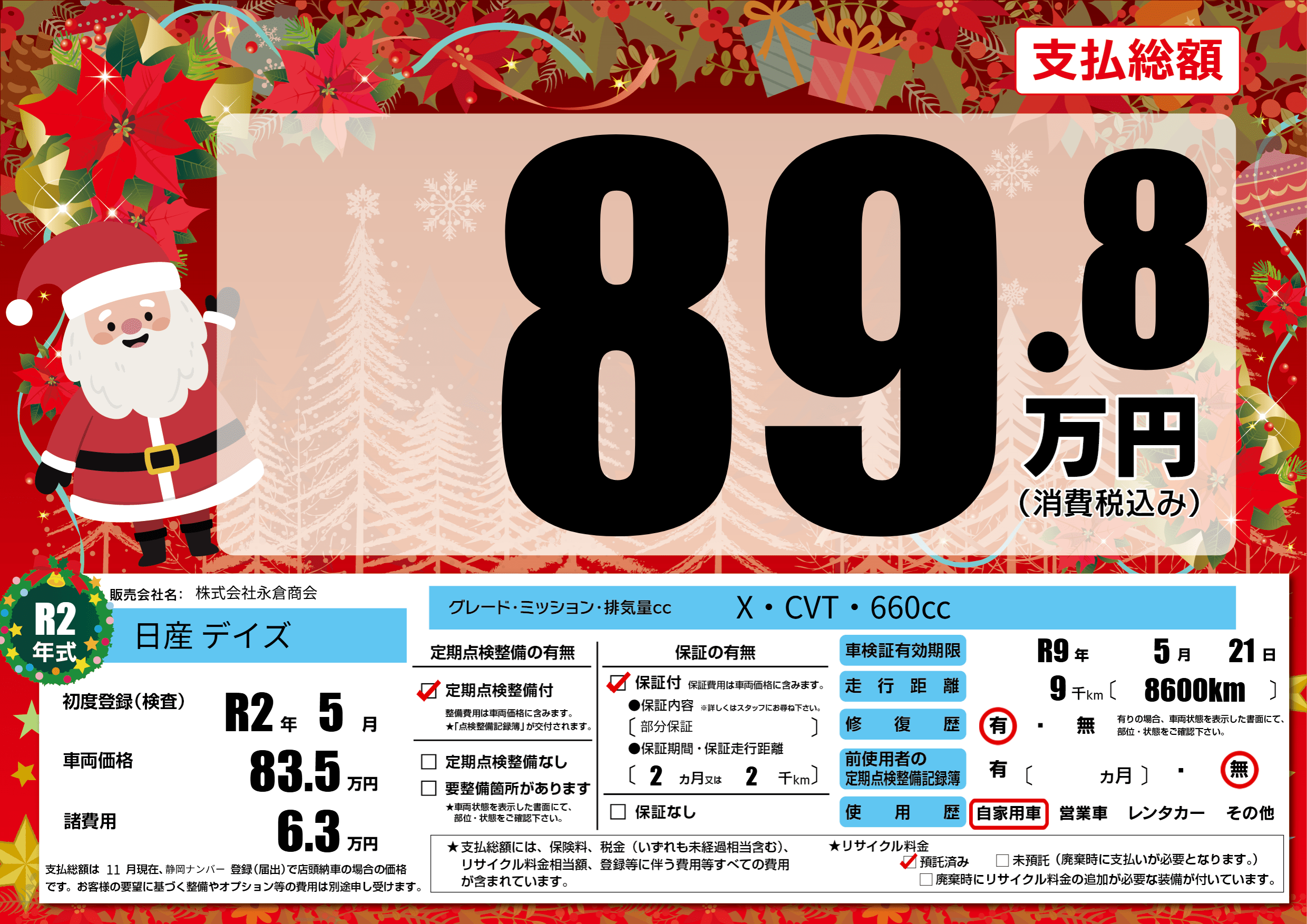 | 車名 | 日産 デイズ | グレード ミッション 排気量 |