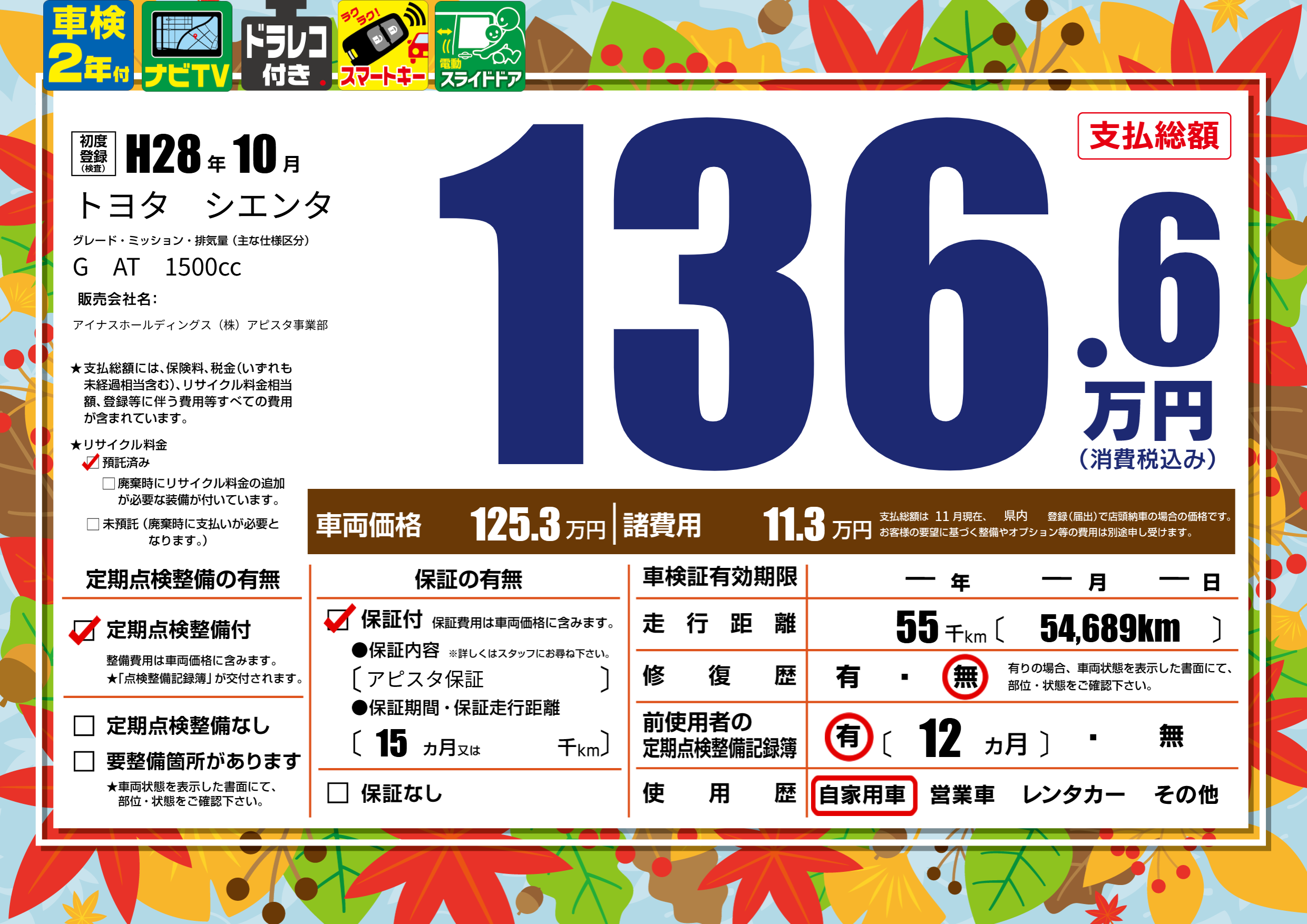 保証付き 保証内容(アピスタ保証) 15ヶ月または()千kmまで |