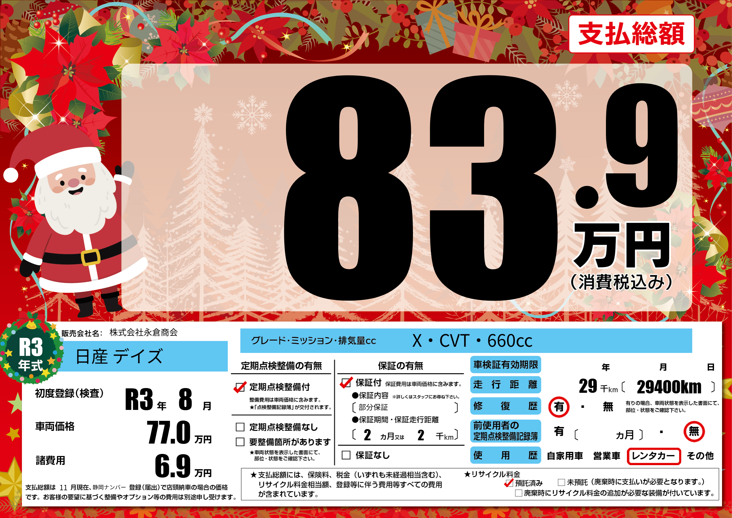 | 車名 | 日産 デイズ | グレード ミッション 排気量 |