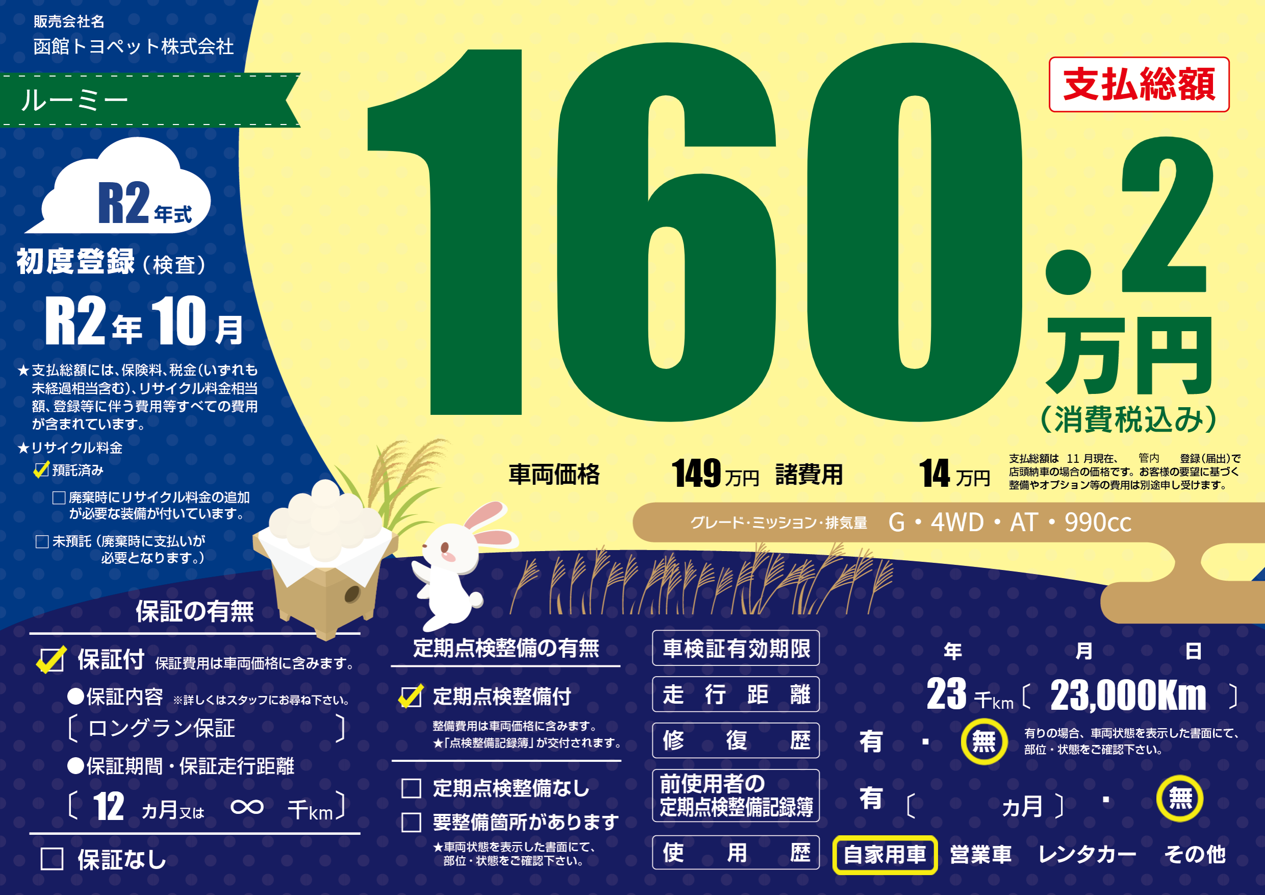 | 走行キロ | 2.3万km | 初年度登録 | R2年10月 |