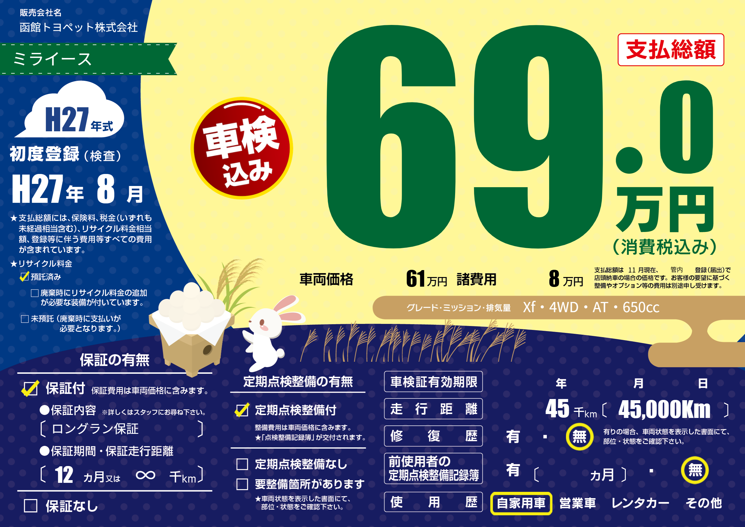 | 車名 | ミライース | グレード ミッション 排気量 |