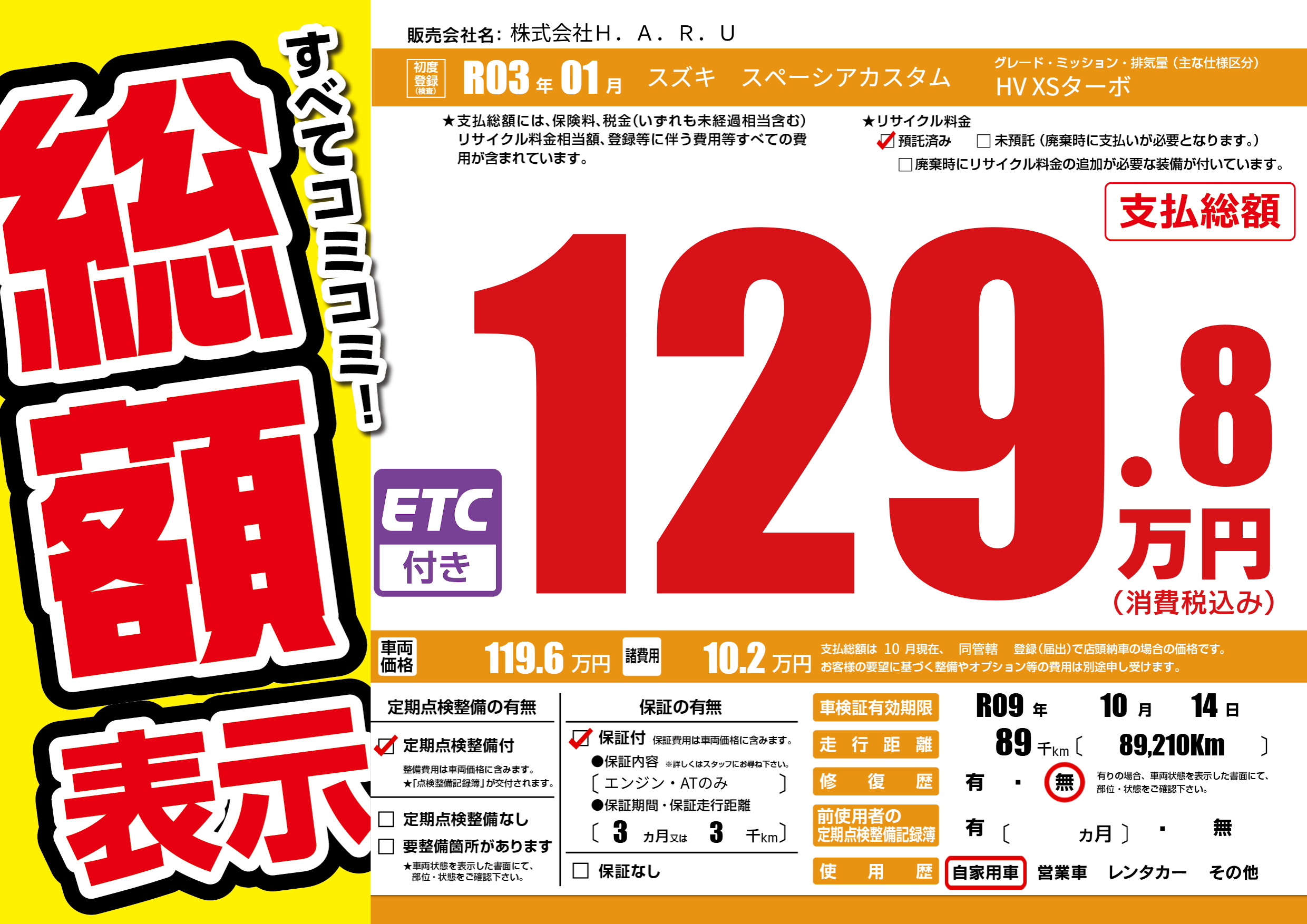 | 車名 | スズキ スペーシアカスタム | グレード ミッション 排気量 |