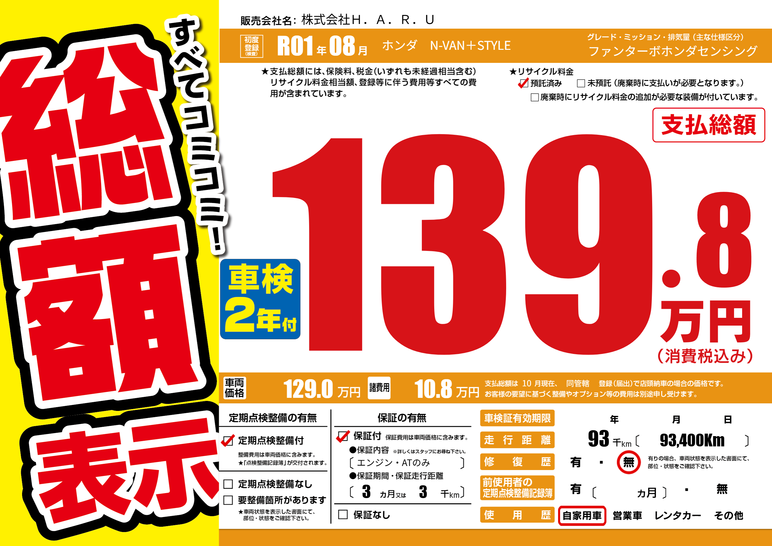 | 走行キロ | 9.3万km | 初年度登録 | R01年08月 |