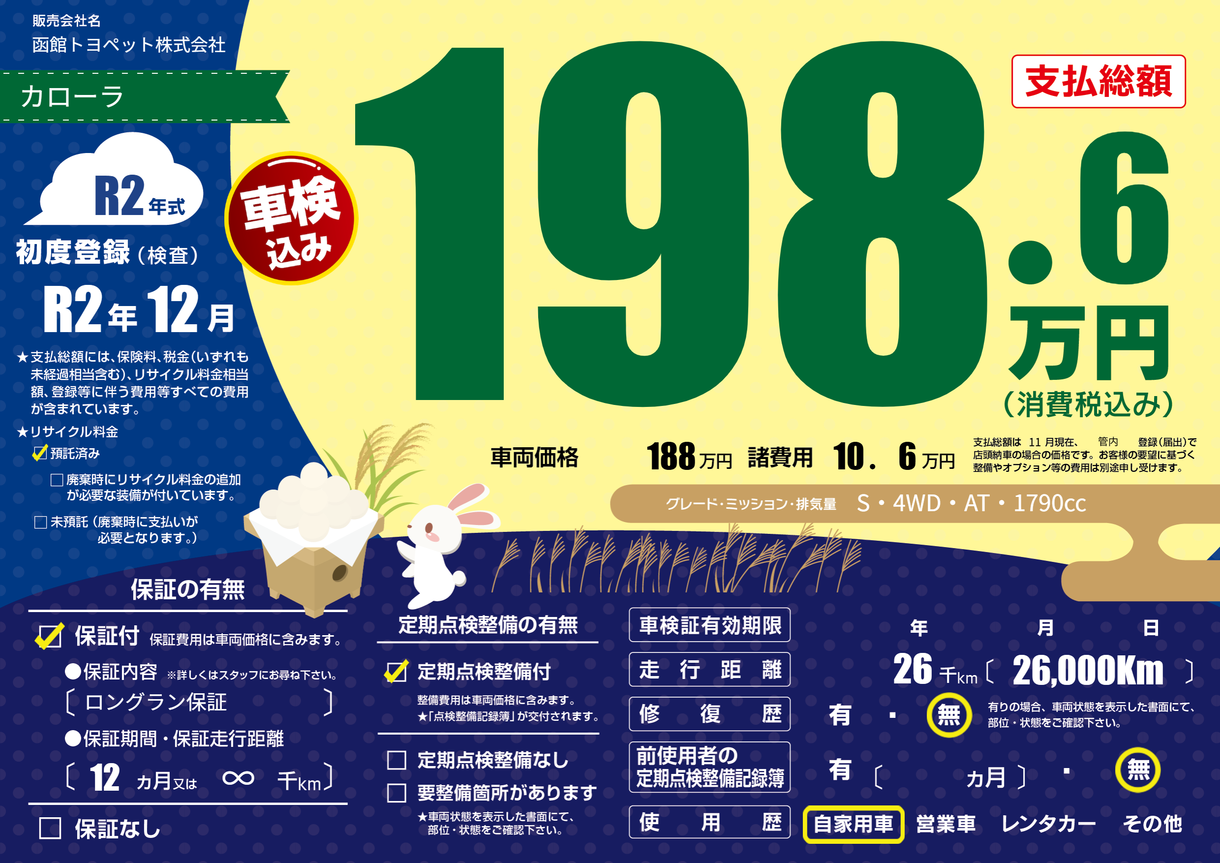 | 走行キロ | 2.6万km | 初年度登録 | R2年12月 |