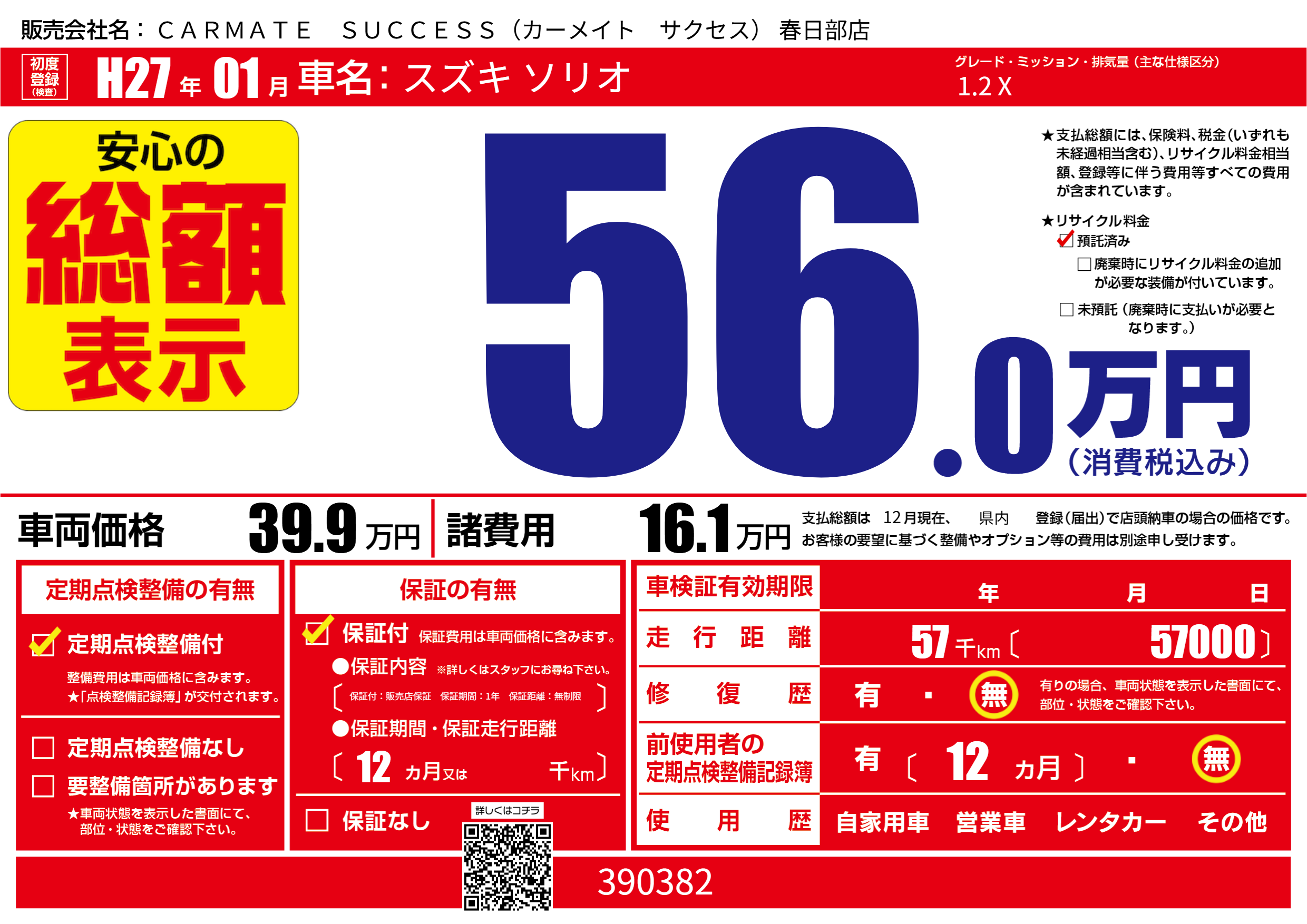 | 車名 | スズキ ソリオ | グレード ミッション 排気量 |