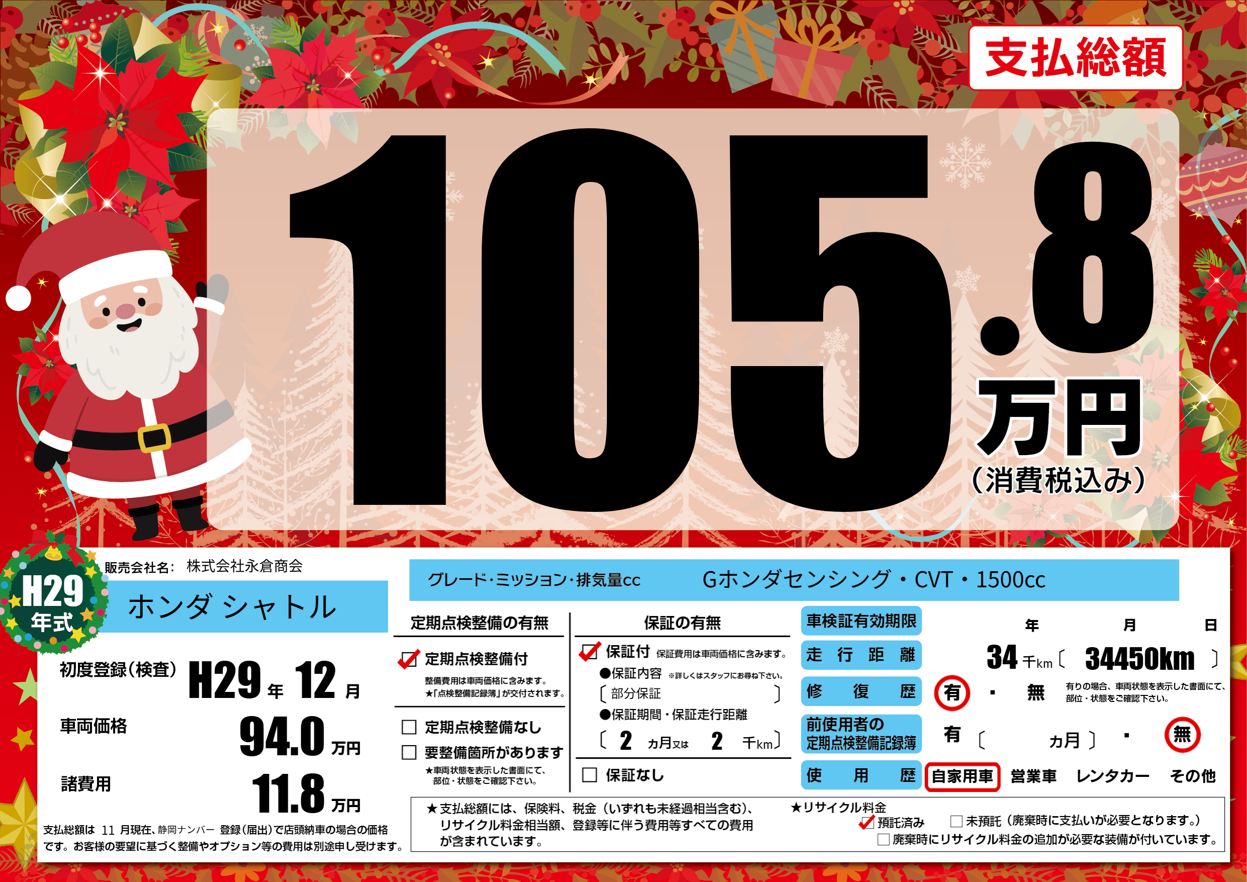 | 走行キロ | 3.4万km | 初年度登録 | H29年12月 |