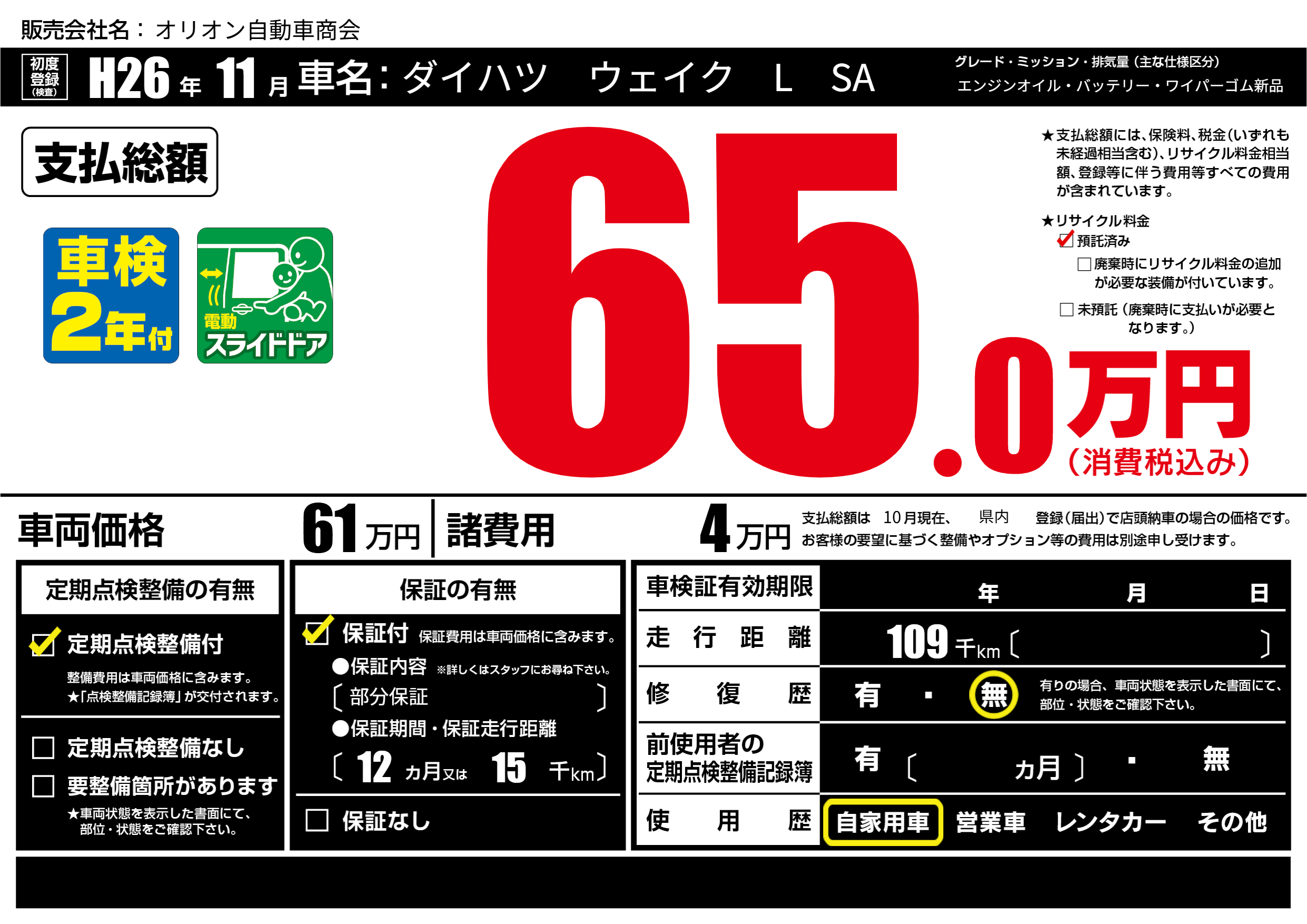| 車名 | ダイハツ ウェイク L SA | グレード ミッション 排気量 |