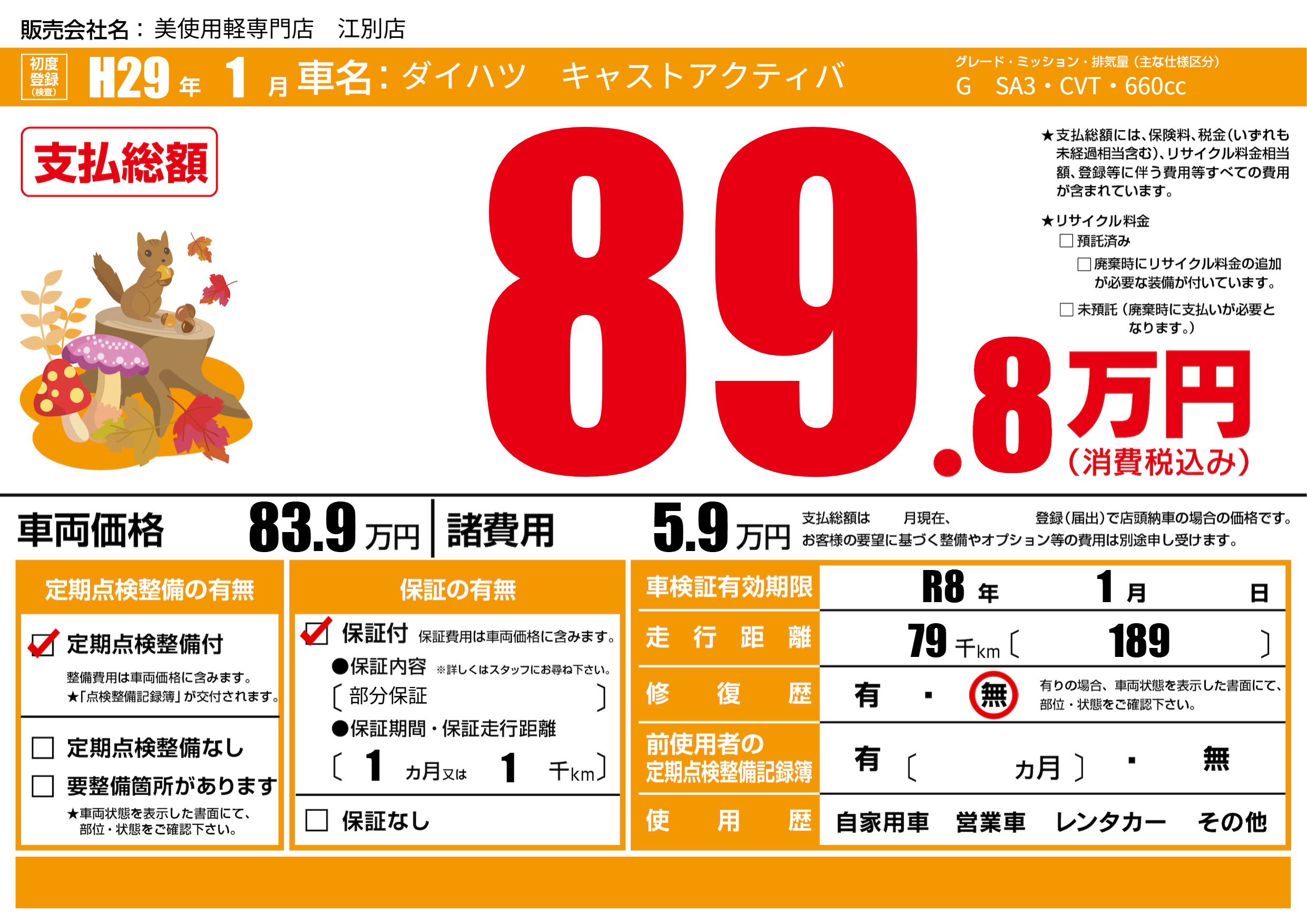 | 車名 | ダイハツ キャストアクティバ | グレード ミッション 排気量 |