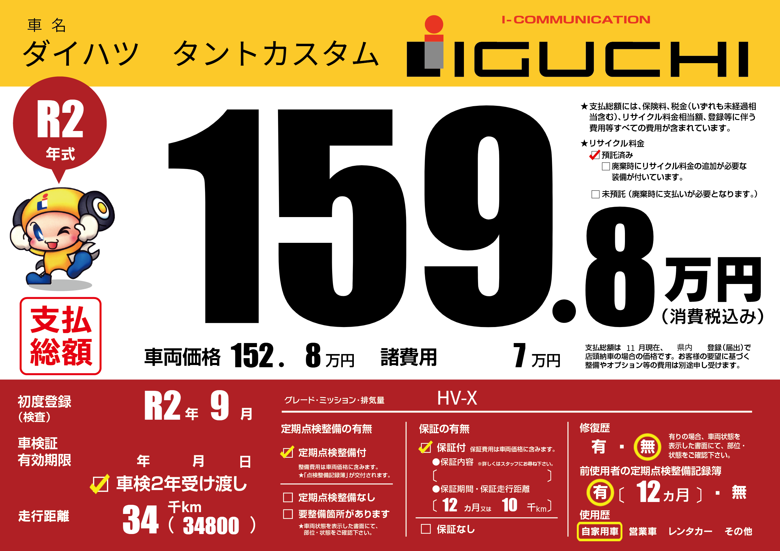 | 走行キロ | 3.4万km | 初年度登録 | R2年9月 |