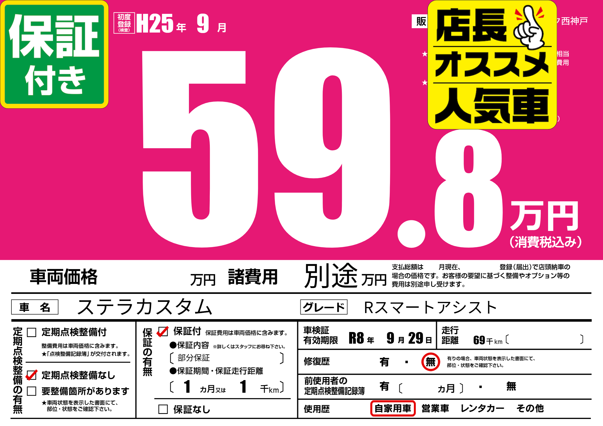 | 走行キロ | 6.9万km | 初年度登録 | H25年9月 |
