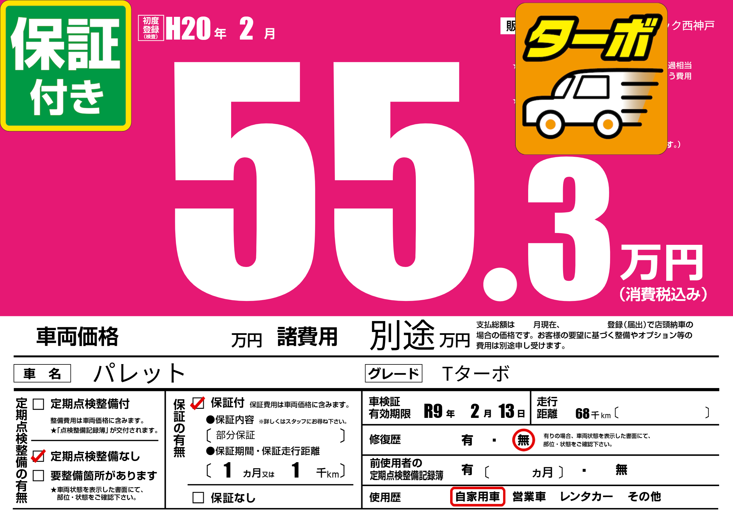 | 走行キロ | 6.8万km | 初年度登録 | H20年2月 |