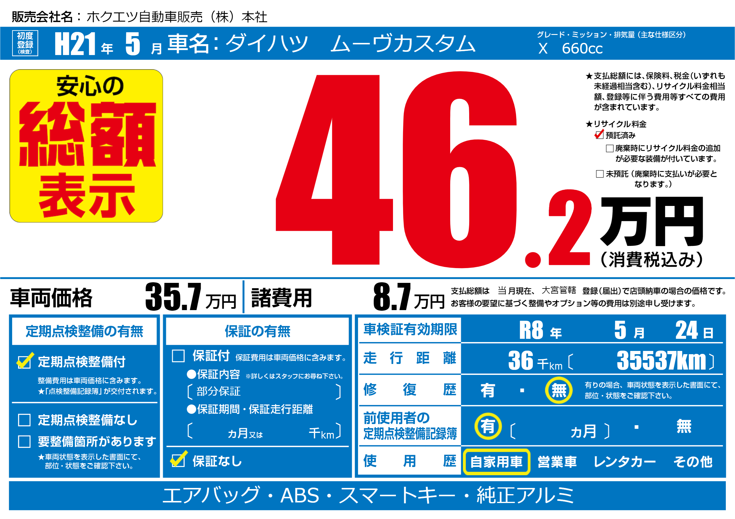 | 走行キロ | 3.6万km | 初年度登録 | H21年5月 |