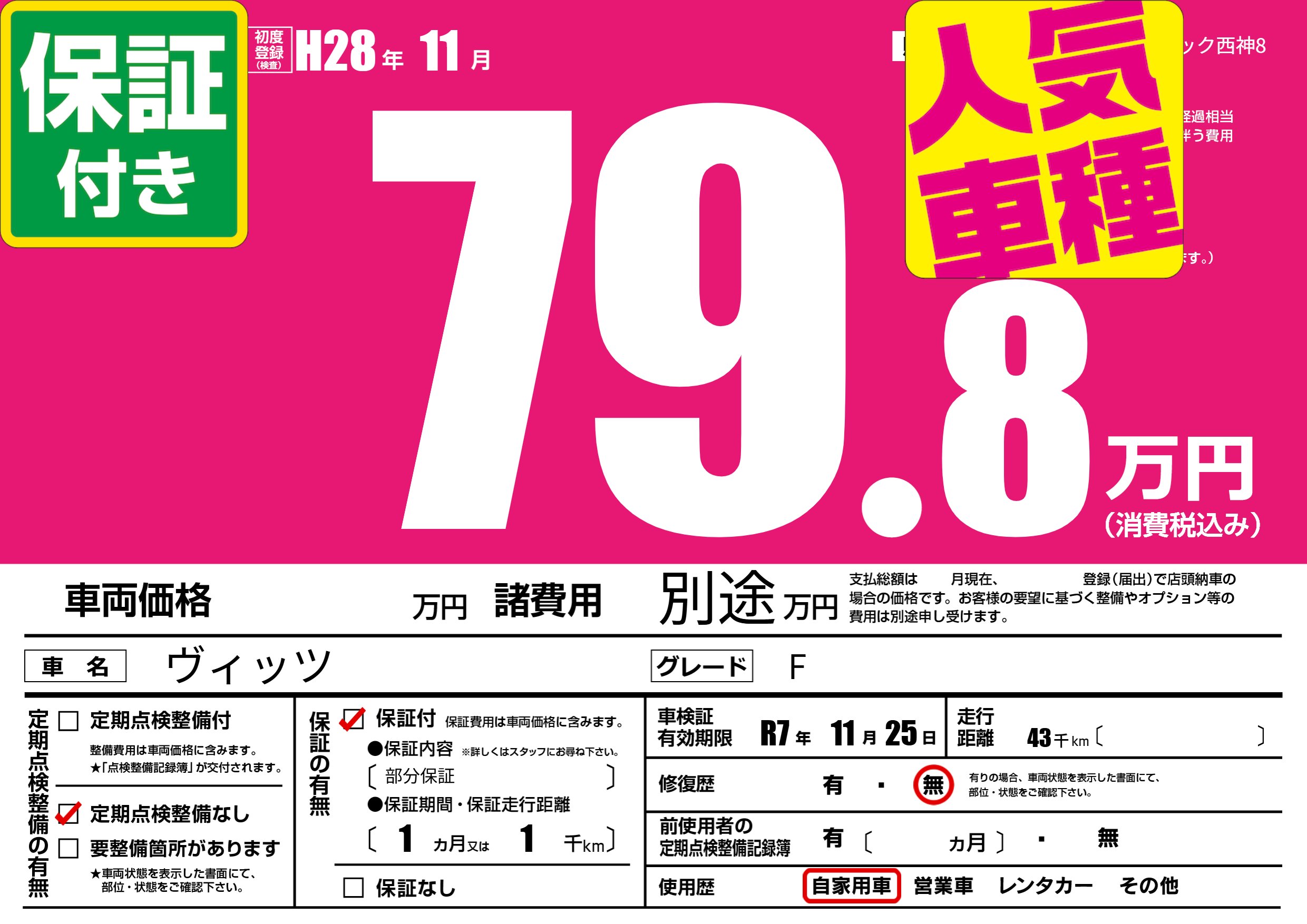 | 車名 | ヴィッツ | グレード ミッション 排気量 |