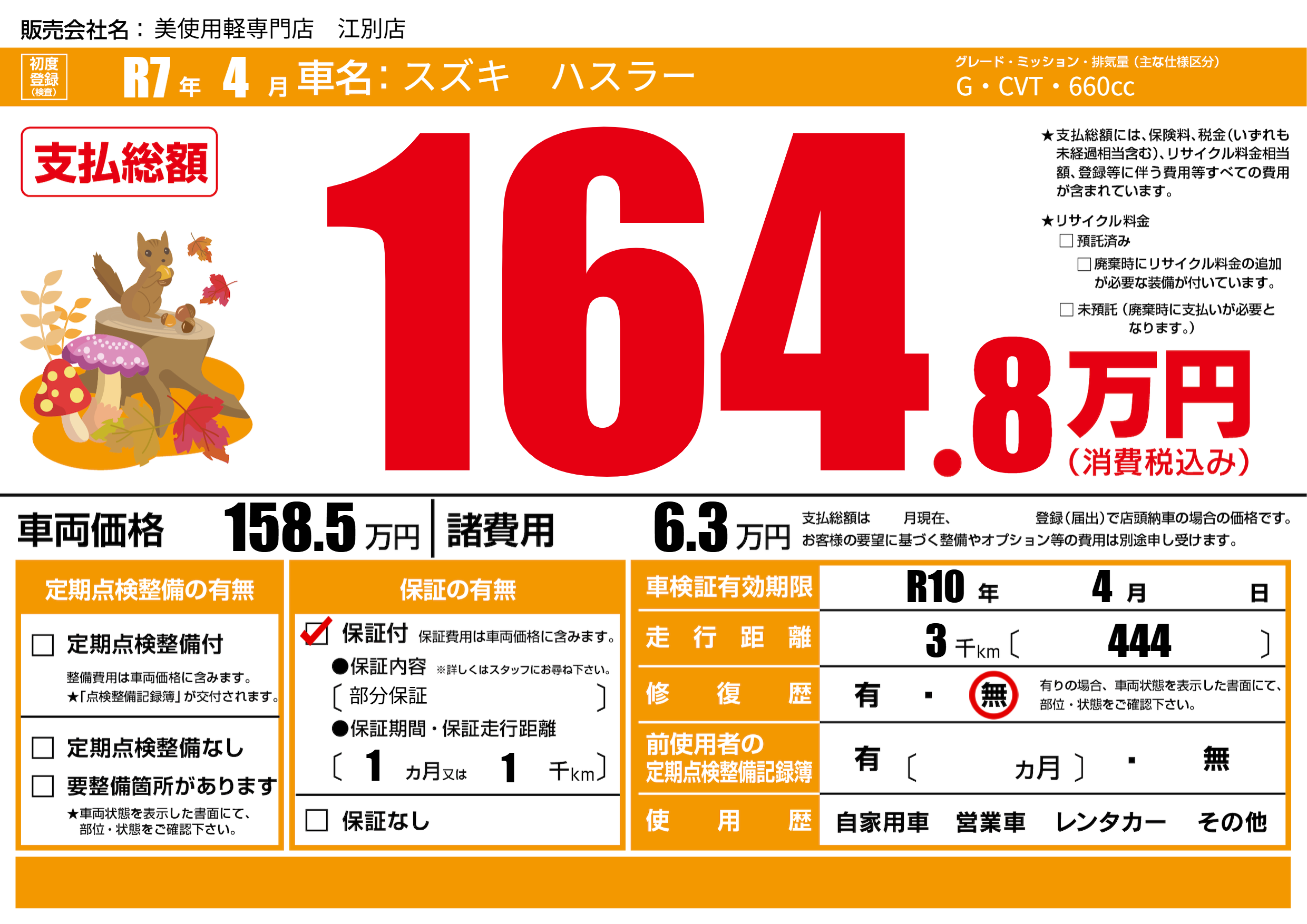 | 車名 | スズキ ハスラー | グレード ミッション 排気量 |