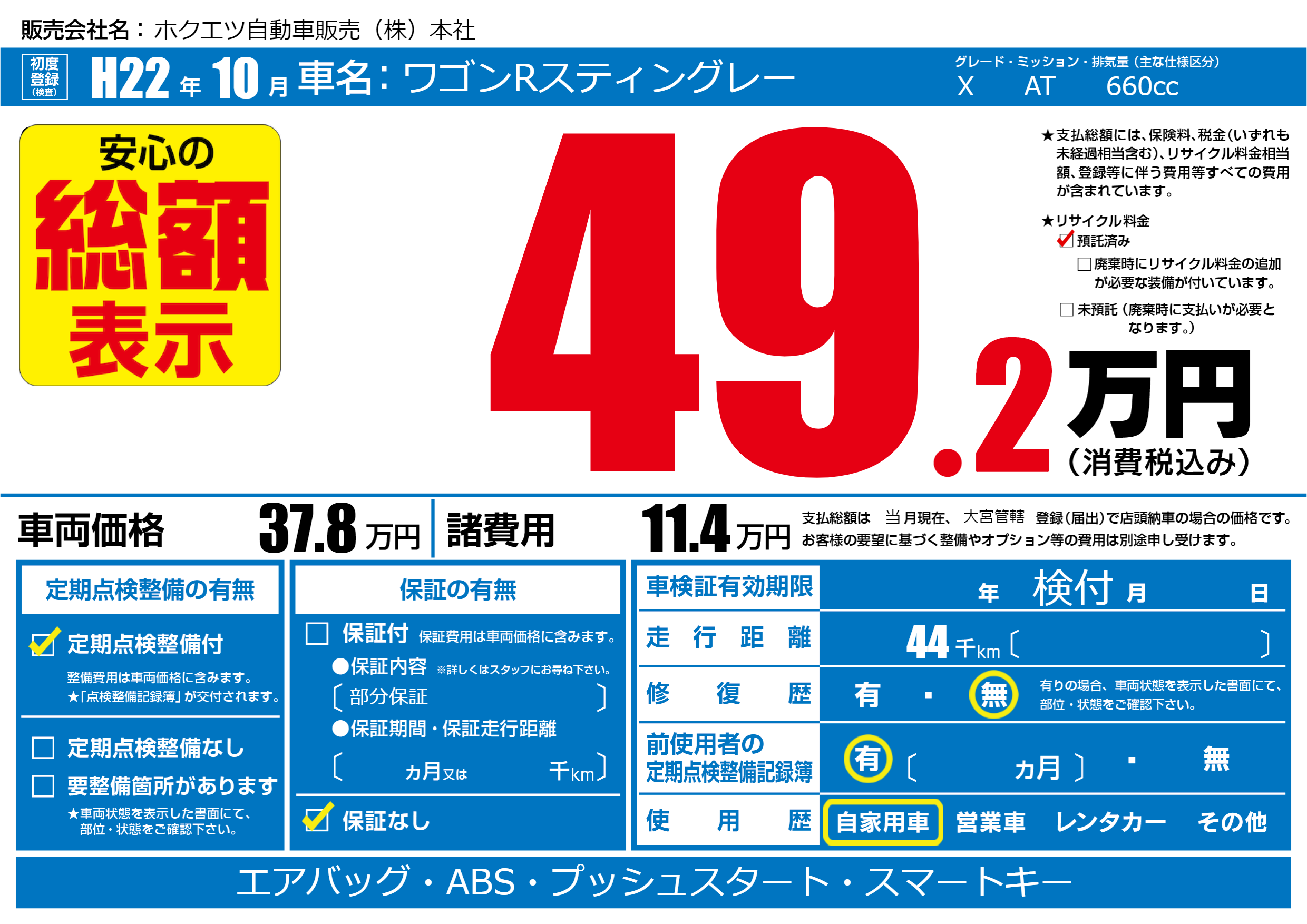 | 走行キロ | 4.4万km | 初年度登録 | H22年10月 |