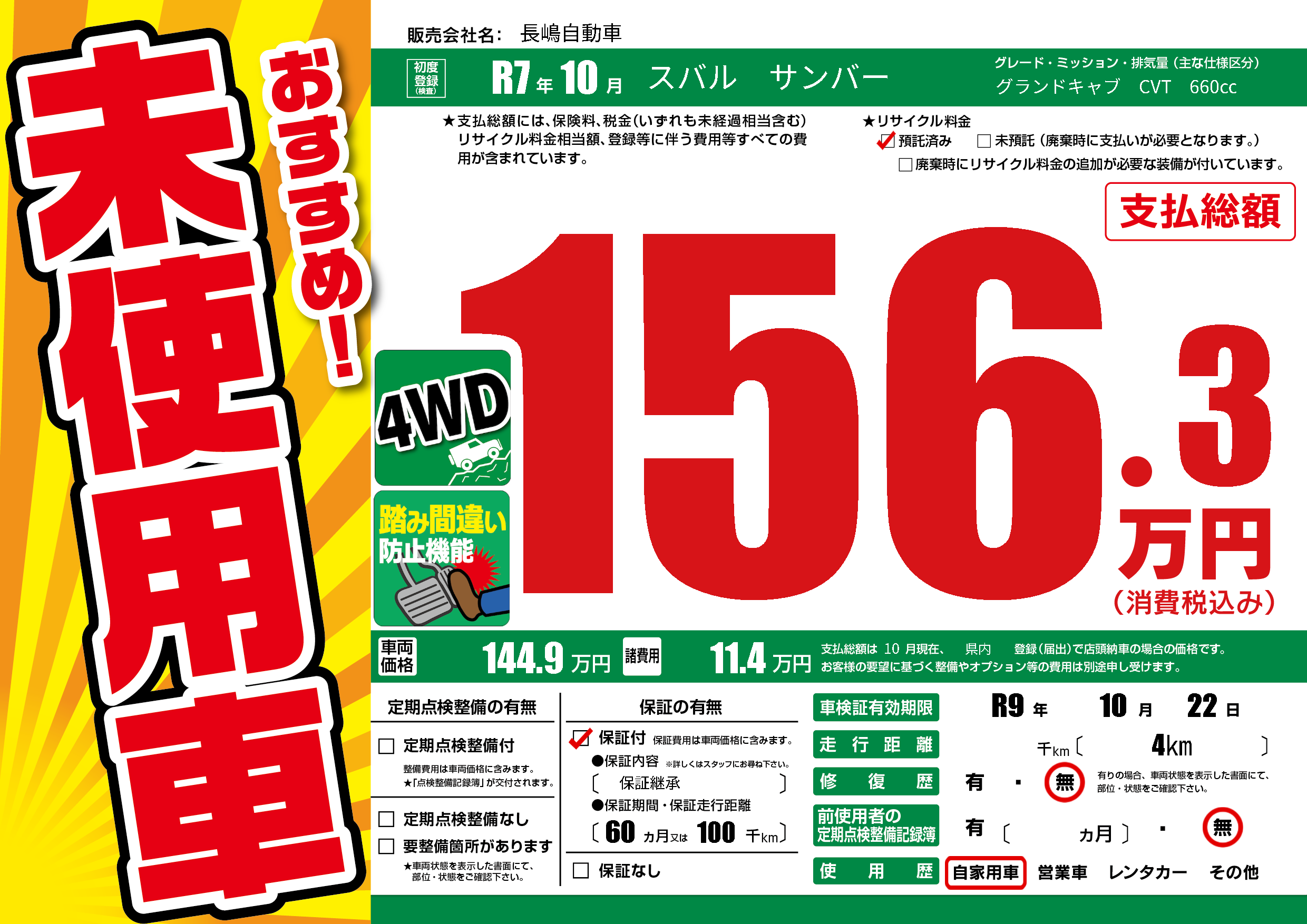 保証付き 保証内容( 保証継承) 60ヶ月または(100)千kmまで |