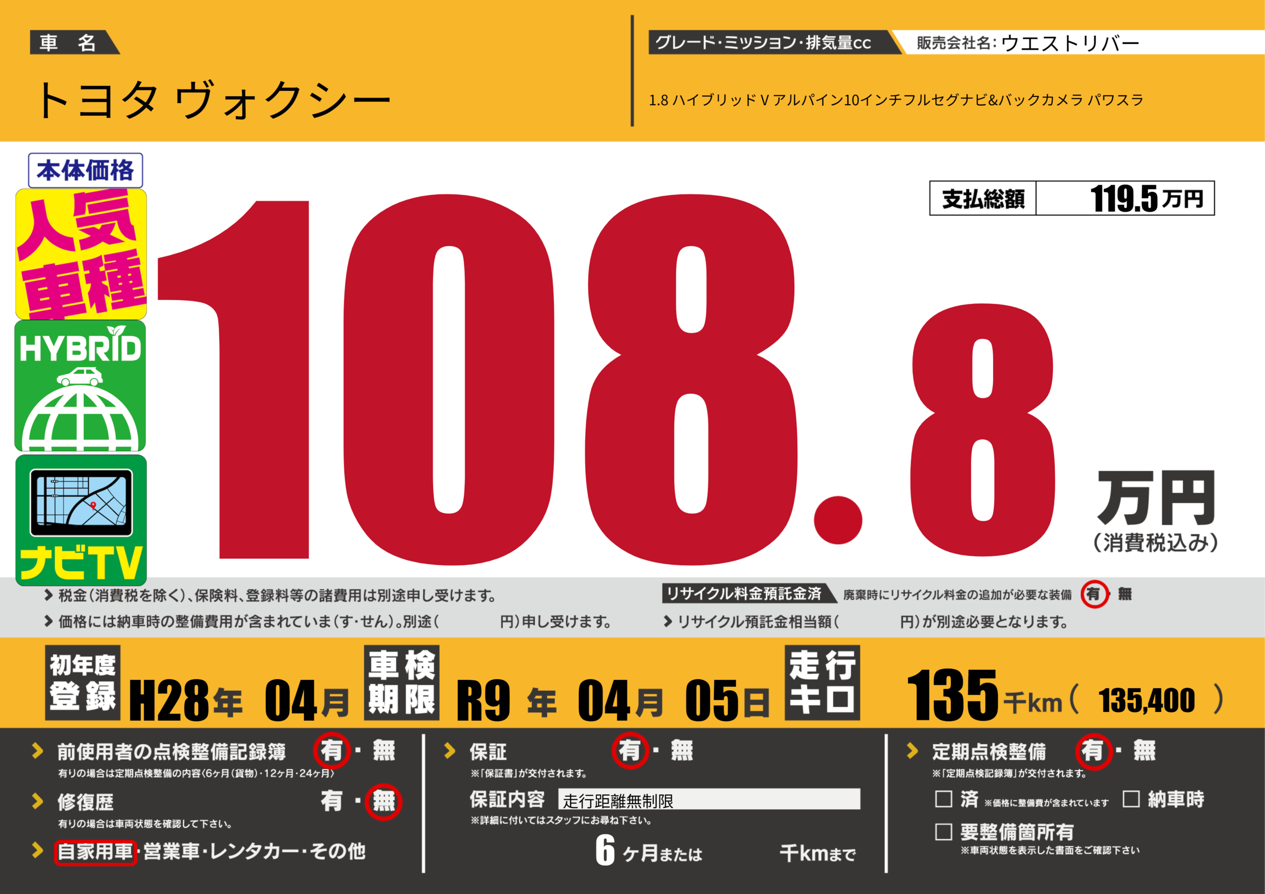 | 走行キロ | 13.5万km | 初年度登録 | H28年04月 |