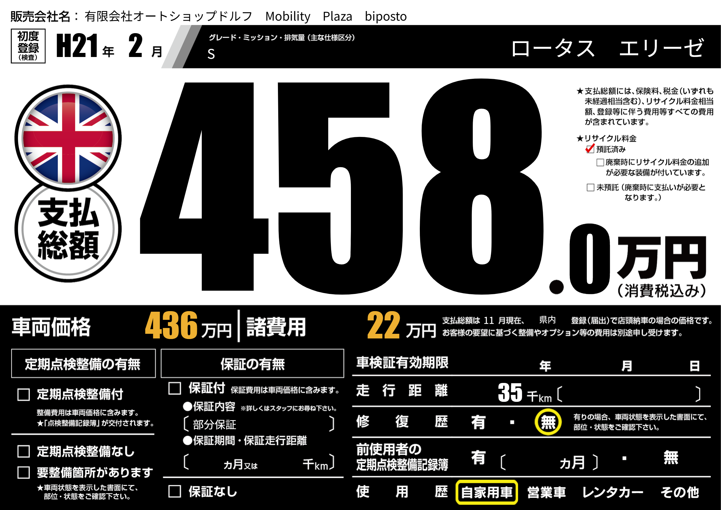 | 走行キロ | 3.5万km | 初年度登録 | H21年2月 |