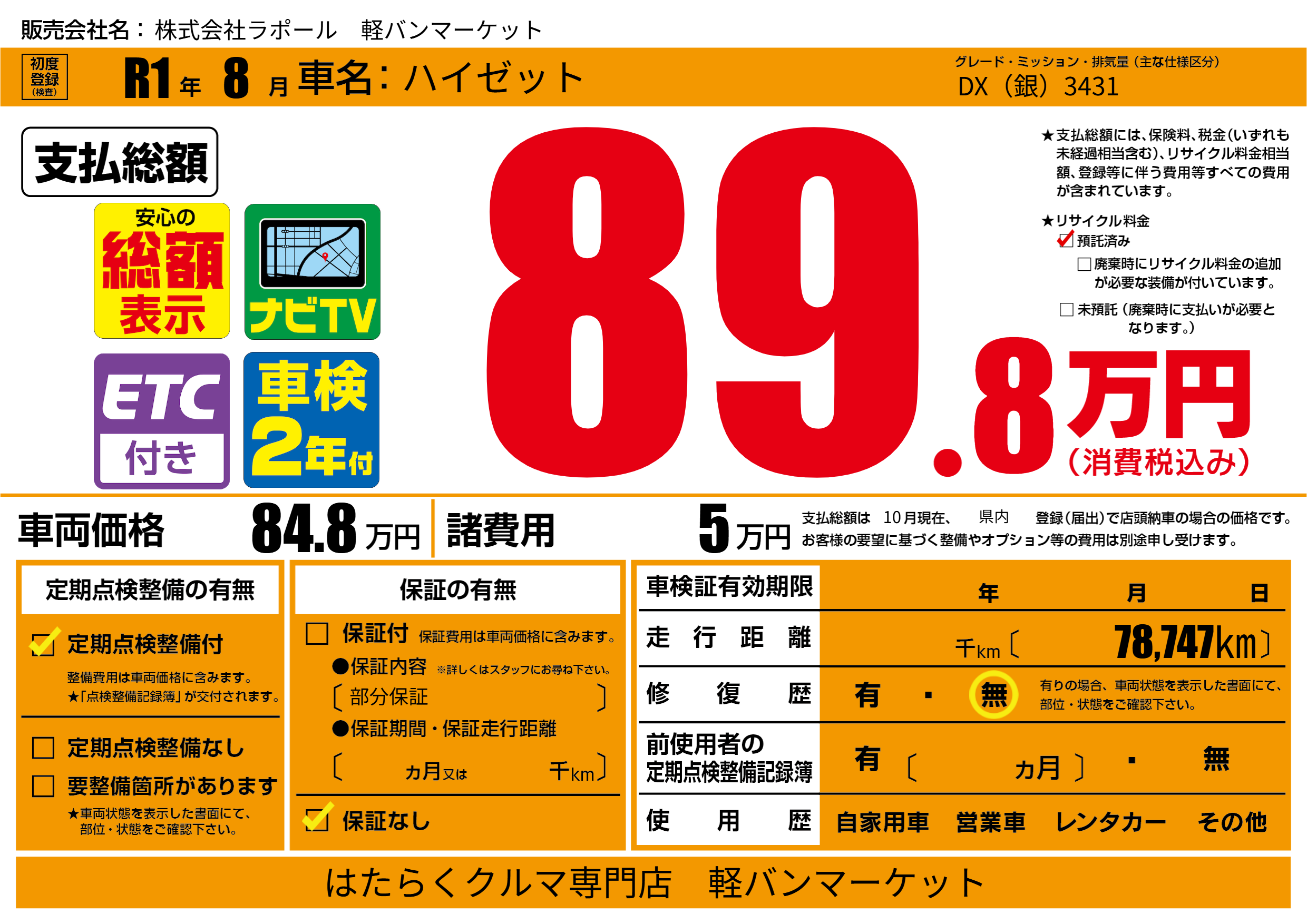 | 車名 | ハイゼット | グレード ミッション 排気量 |