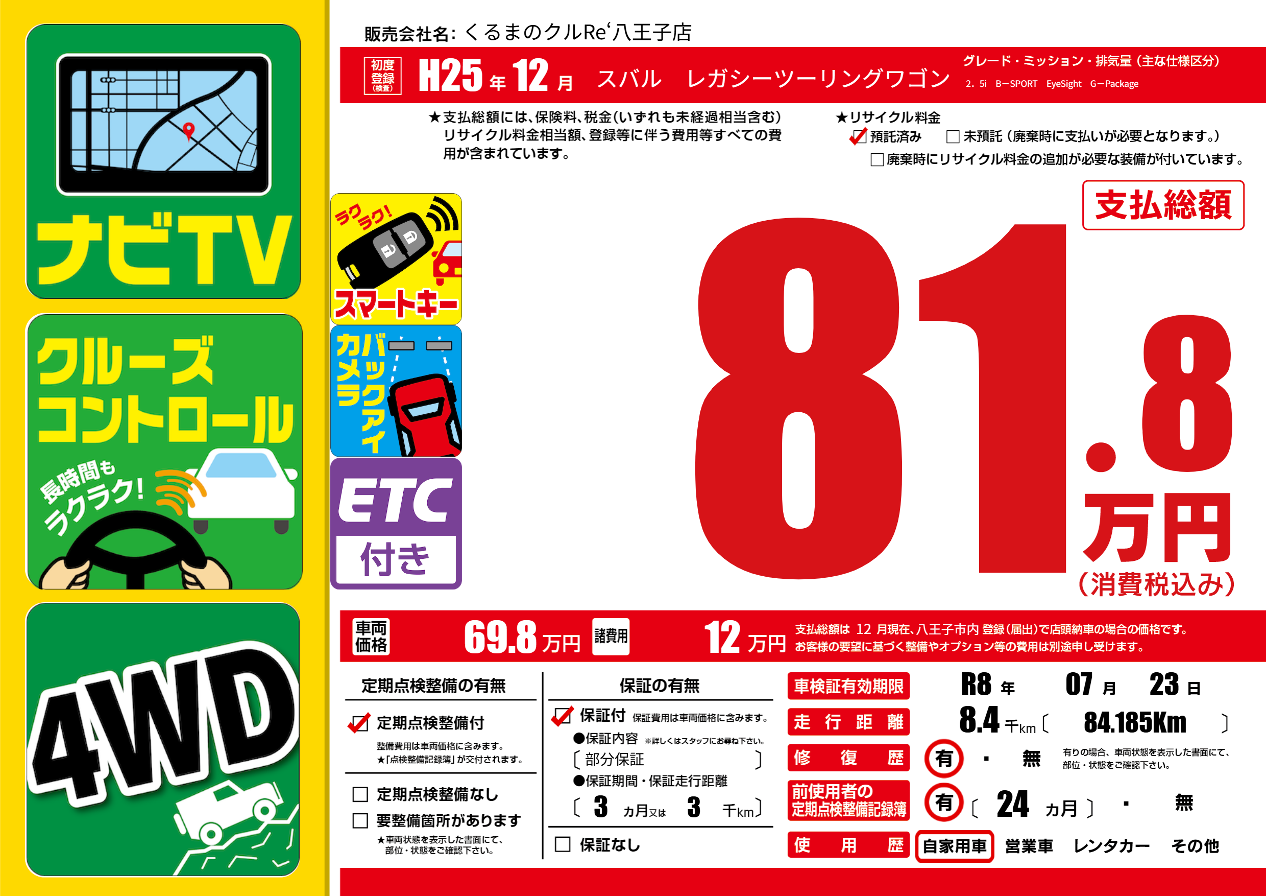 | 走行キロ | 0.8万km | 初年度登録 | H25年12月 |