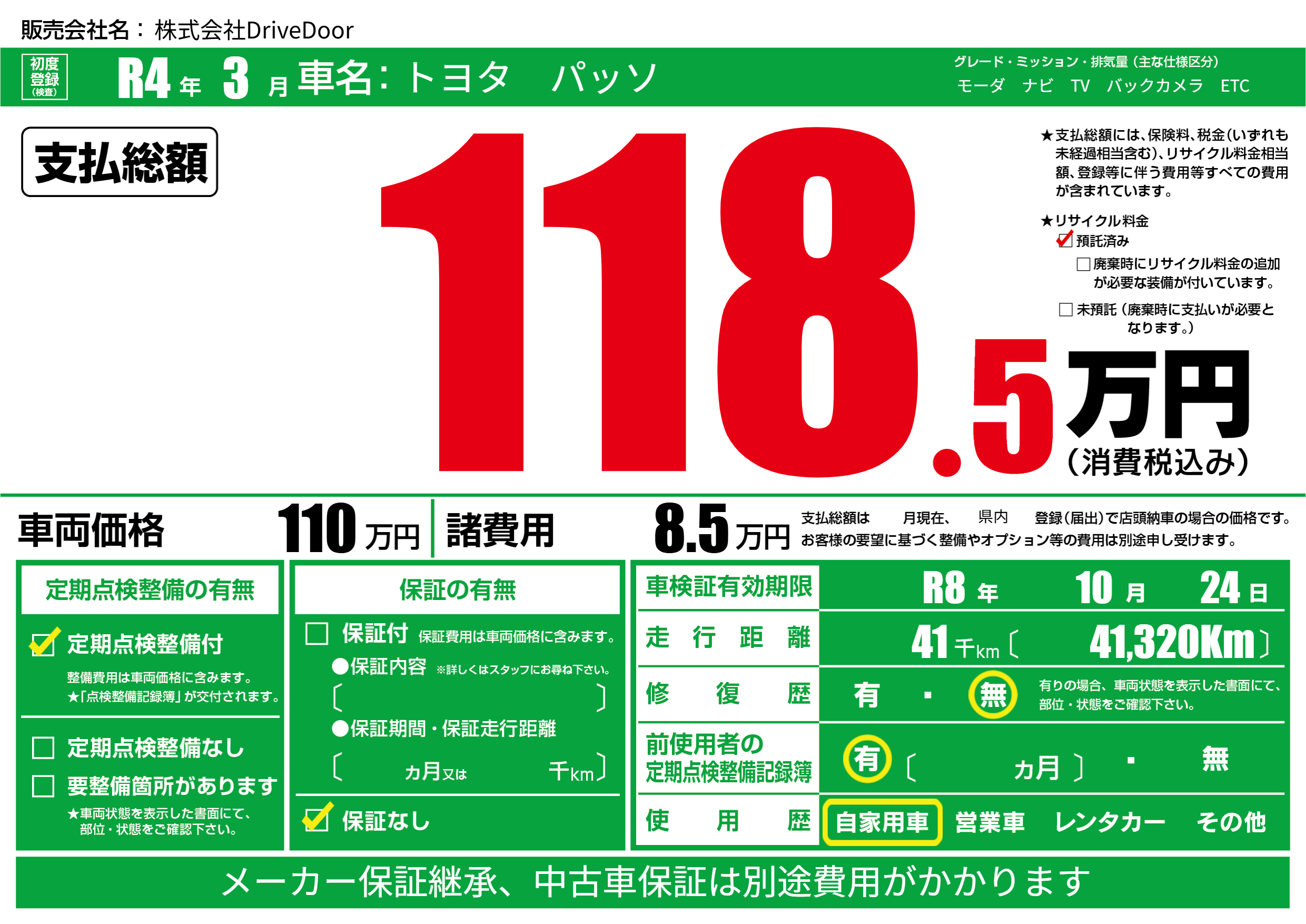 | 車名 | トヨタ パッソ | グレード ミッション 排気量 |