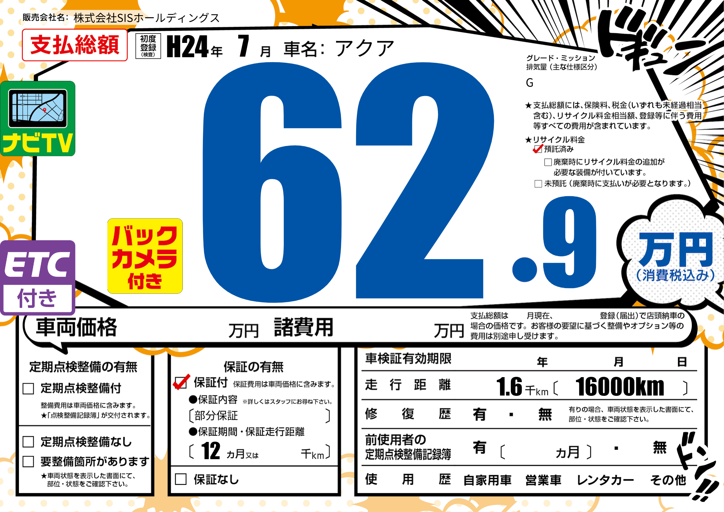 | 走行キロ | 0.1万km | 初年度登録 | H24年7月 |