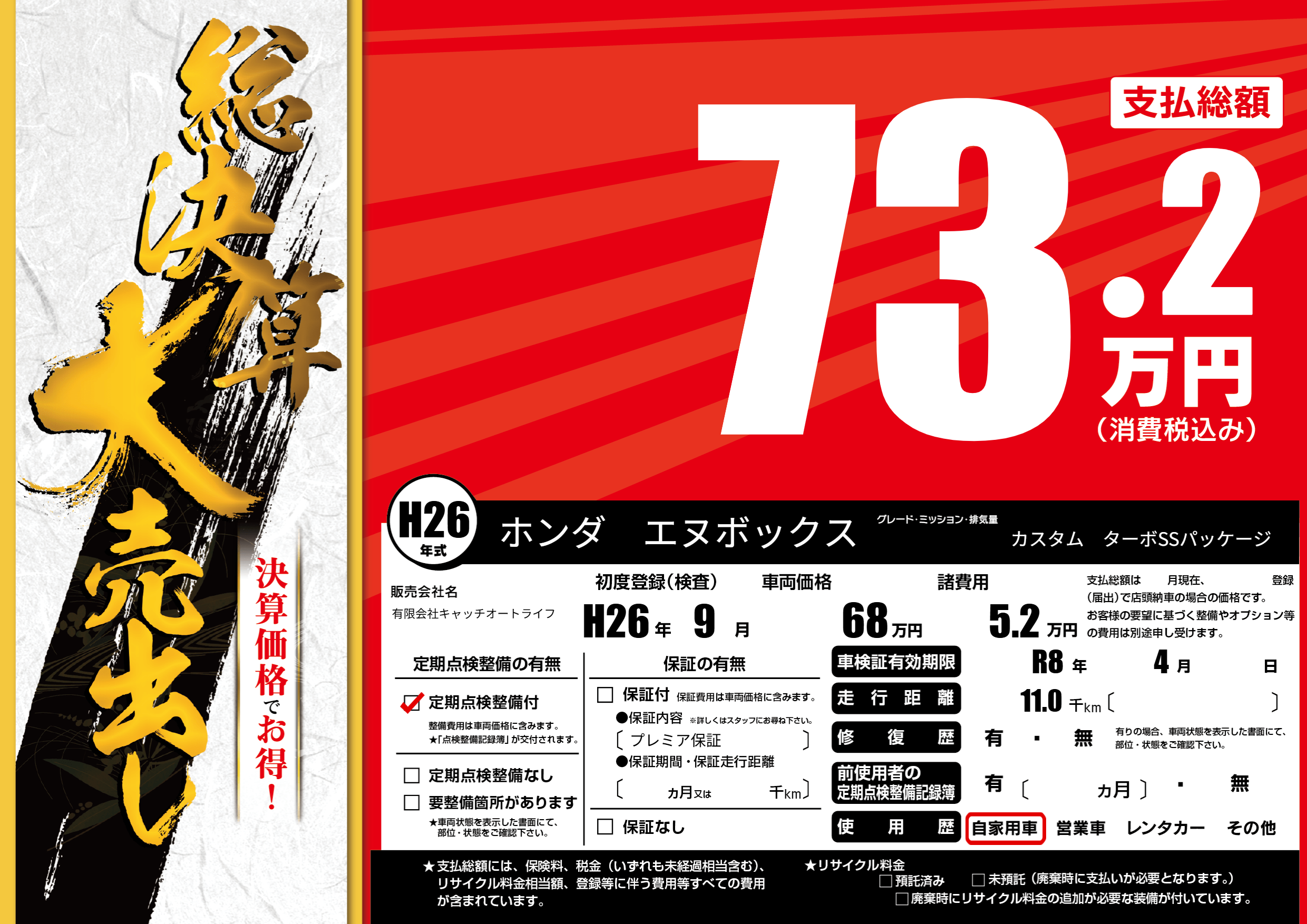 | 車名 | ホンダ エヌボックス | グレード ミッション 排気量 |