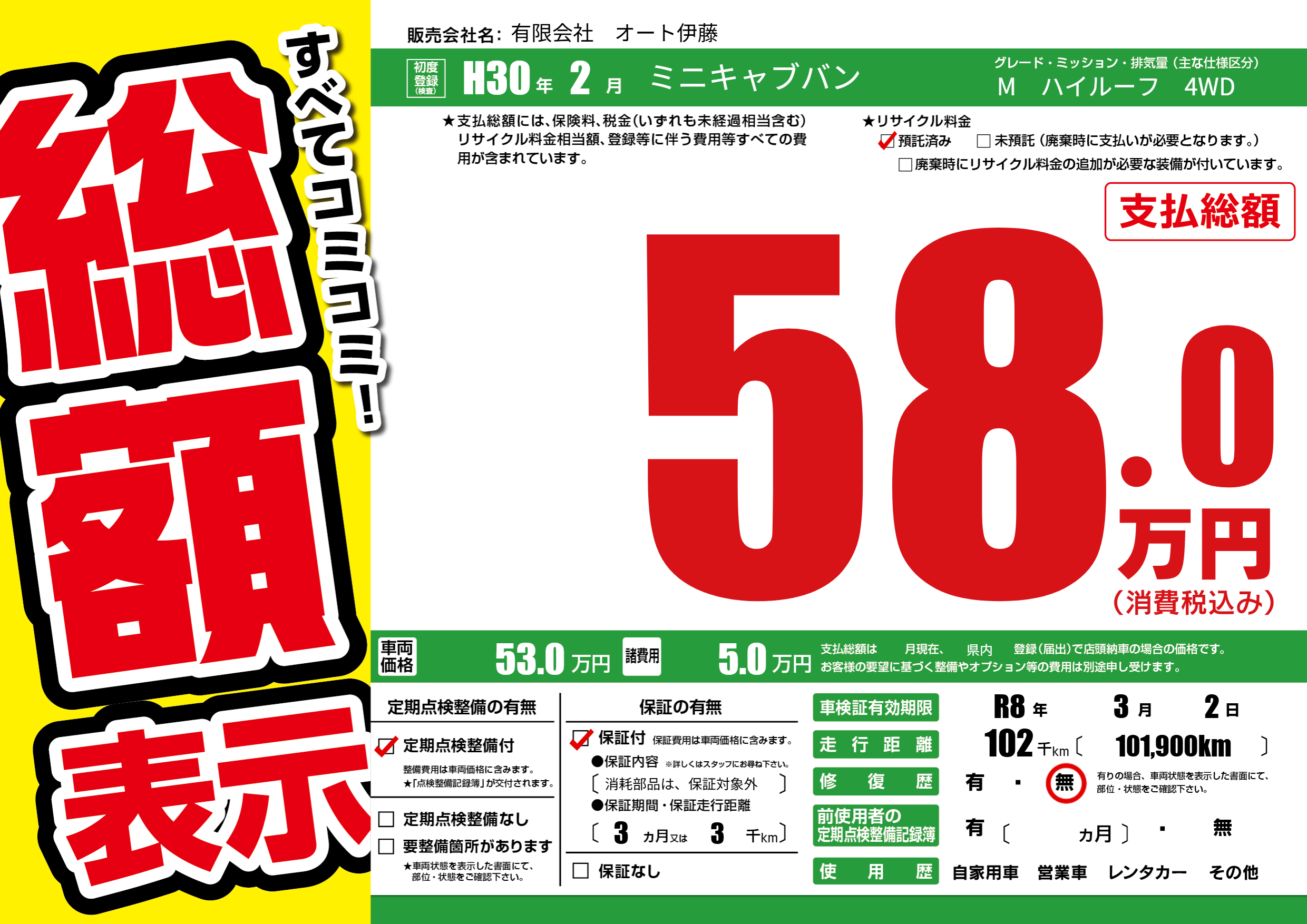 保証付き 保証内容(消耗部品は、保証対象外) 3ヶ月または3千km |