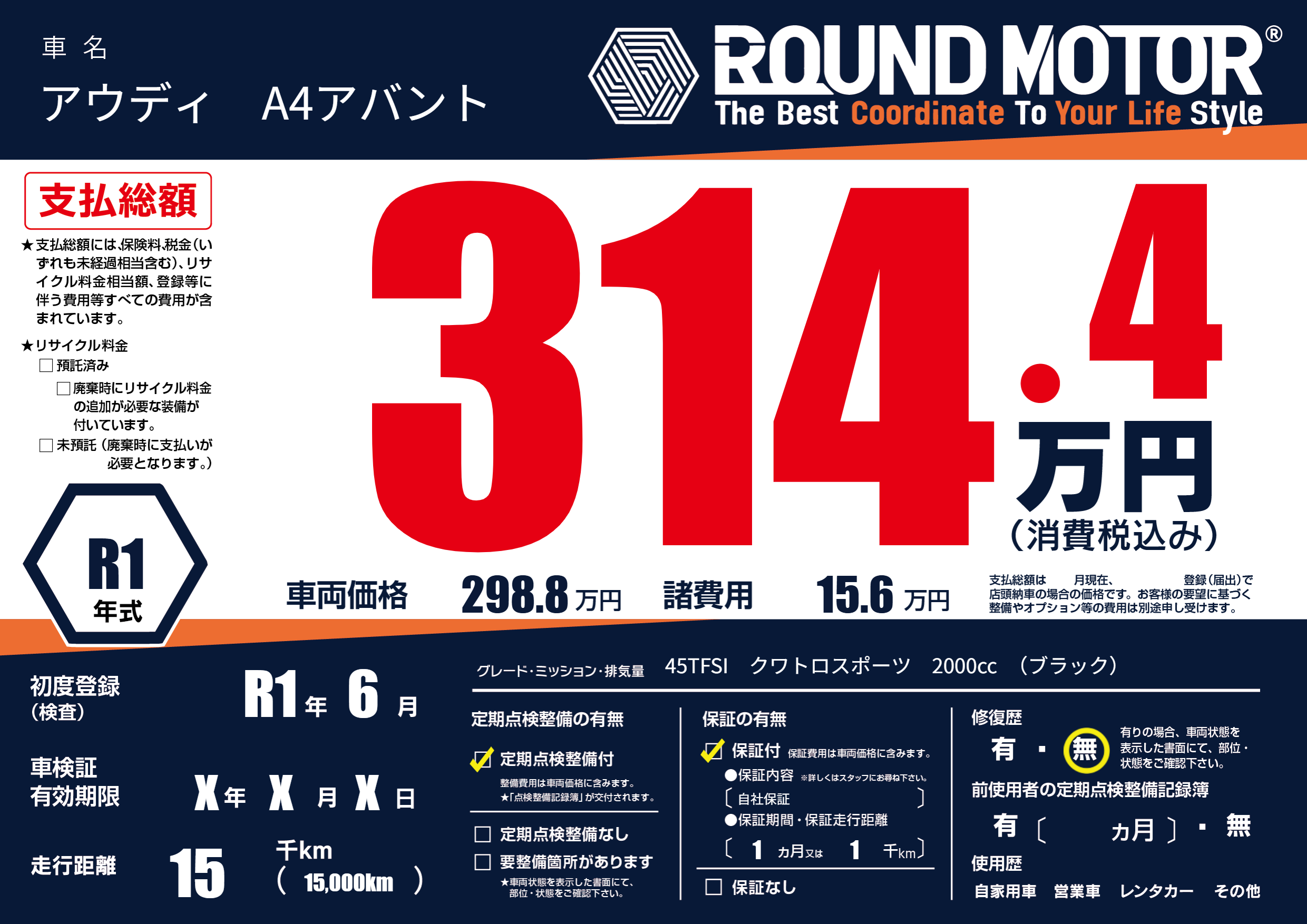 | 車名 | アウディ A4アバント | グレード ミッション 排気量 |