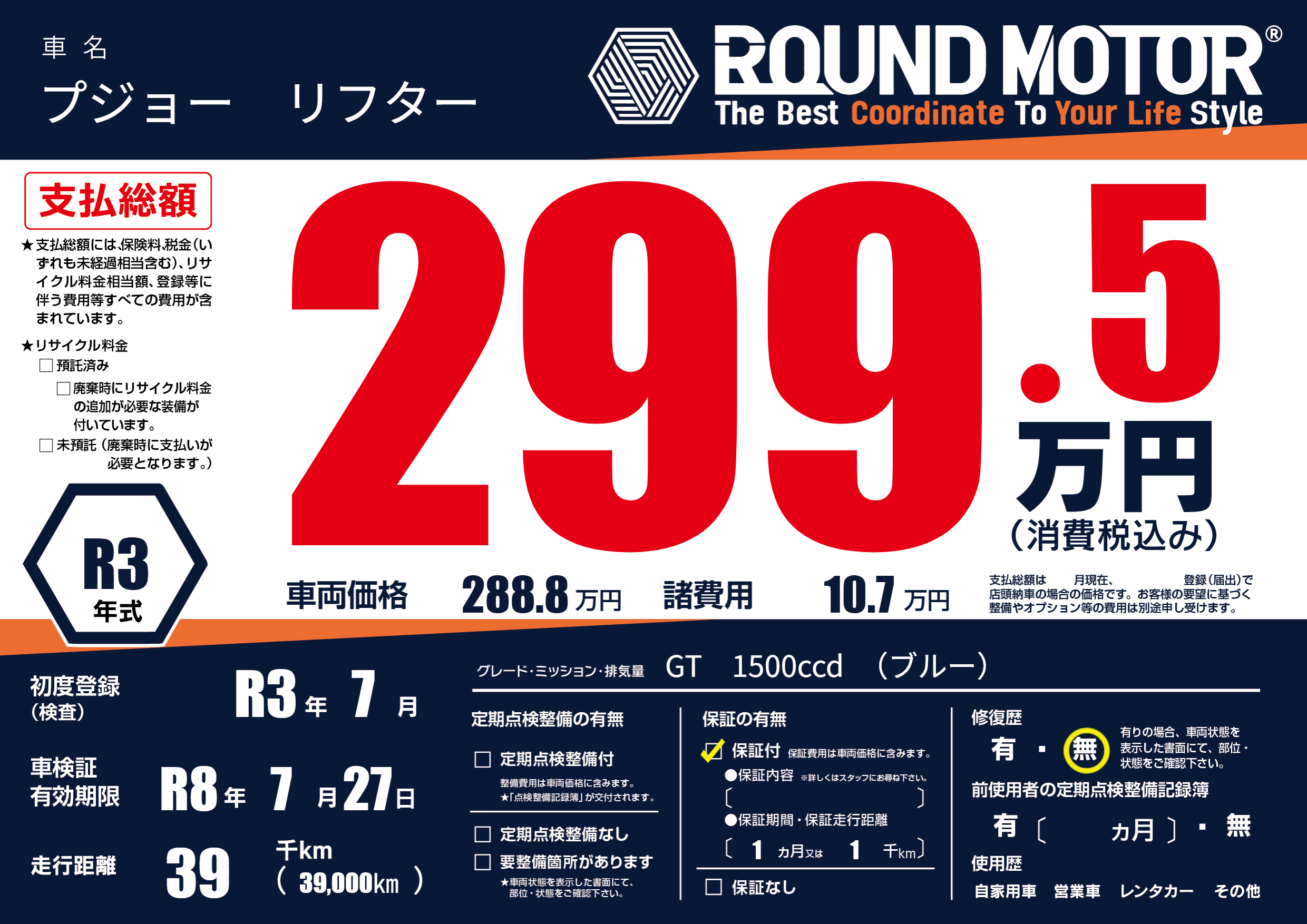 | 車名 | プジョー リフター | グレード ミッション 排気量 |