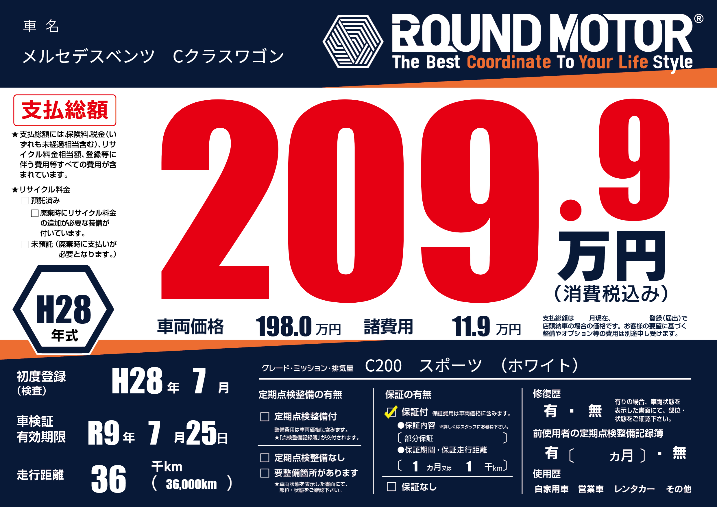 | 車名 | メルセデスベンツ Cクラスワゴン | グレード ミッション 排気量 |