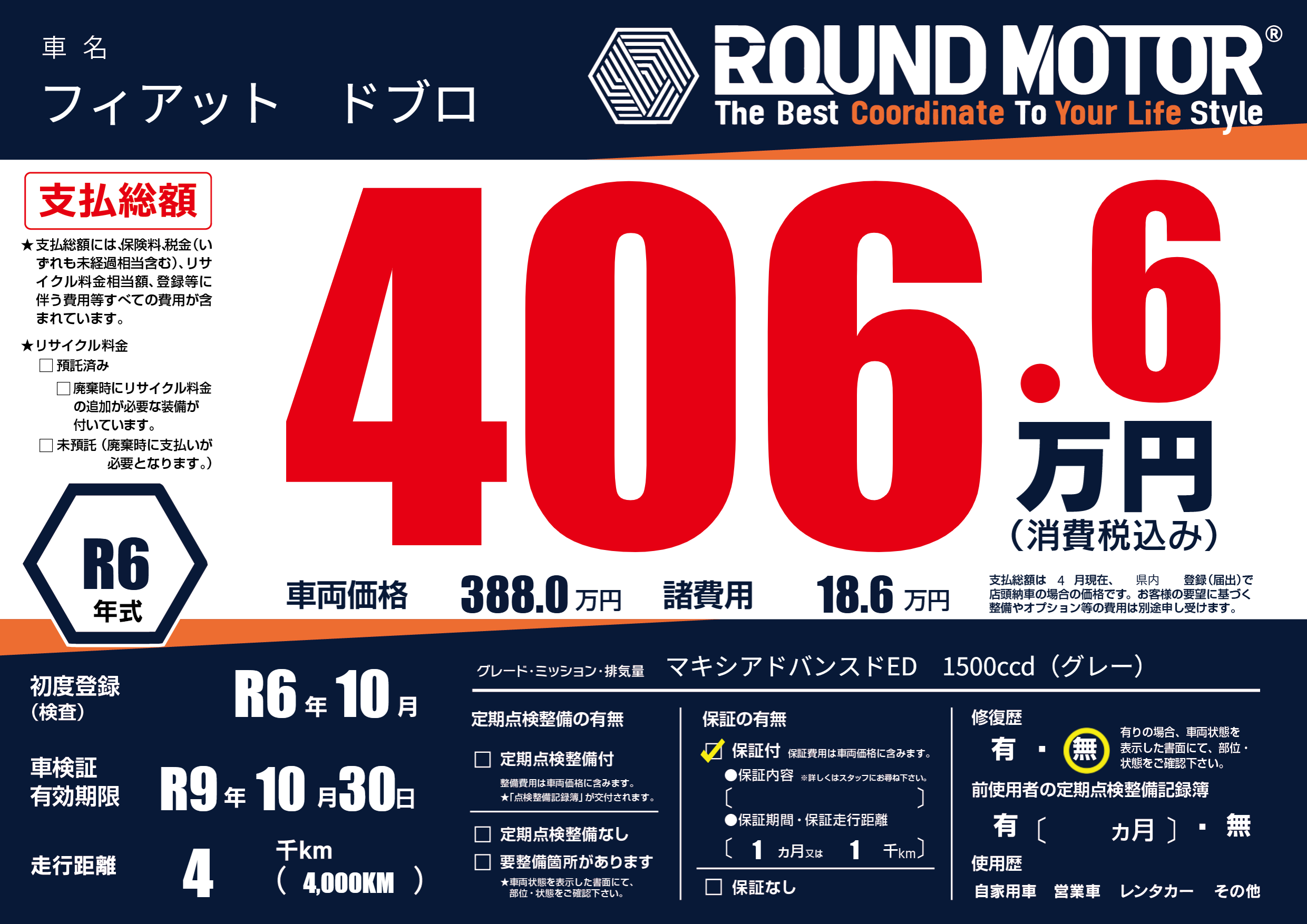 | 走行キロ | 0.4万km | 初年度登録 | R6年10月 |
