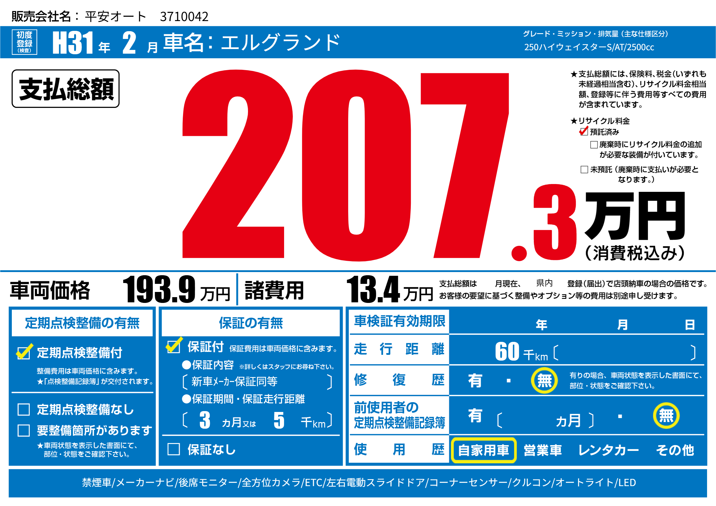 | 初年度登録 | H31年2月 | ||