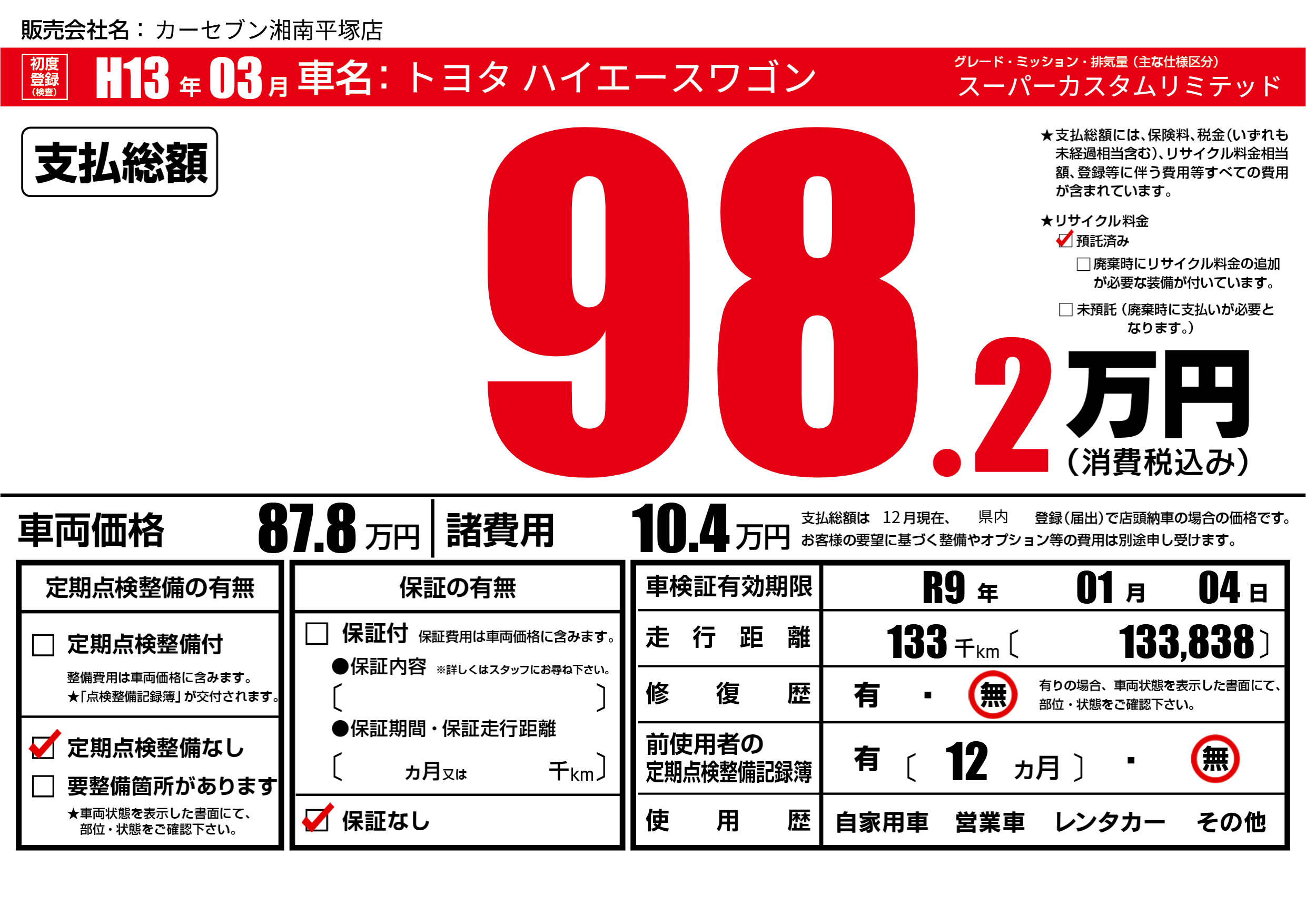 なし | 車検制限 | R9年01月04月 |