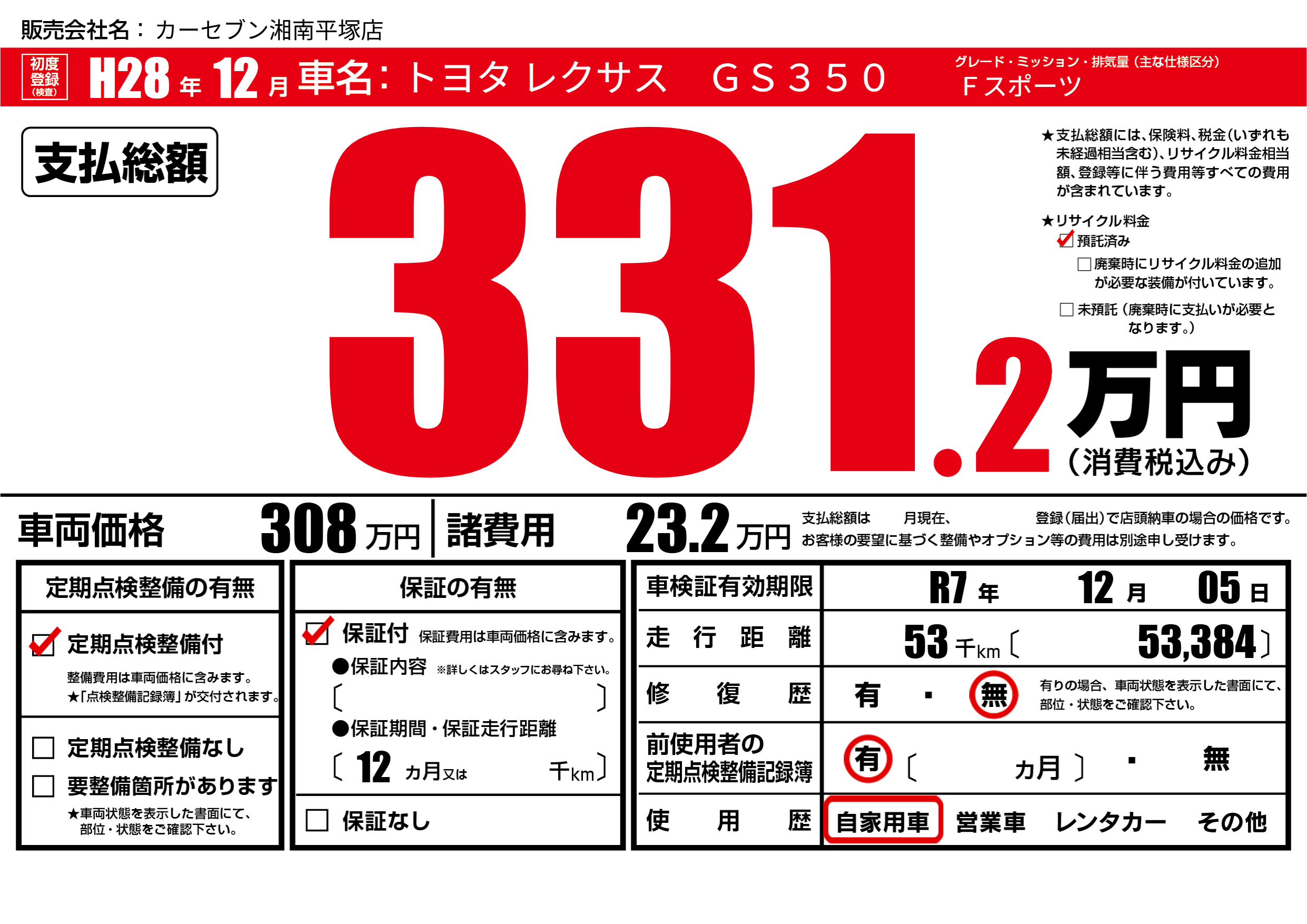 | 車名 | トヨタ レクサス GS350 | グレード ミッション 排気量 |