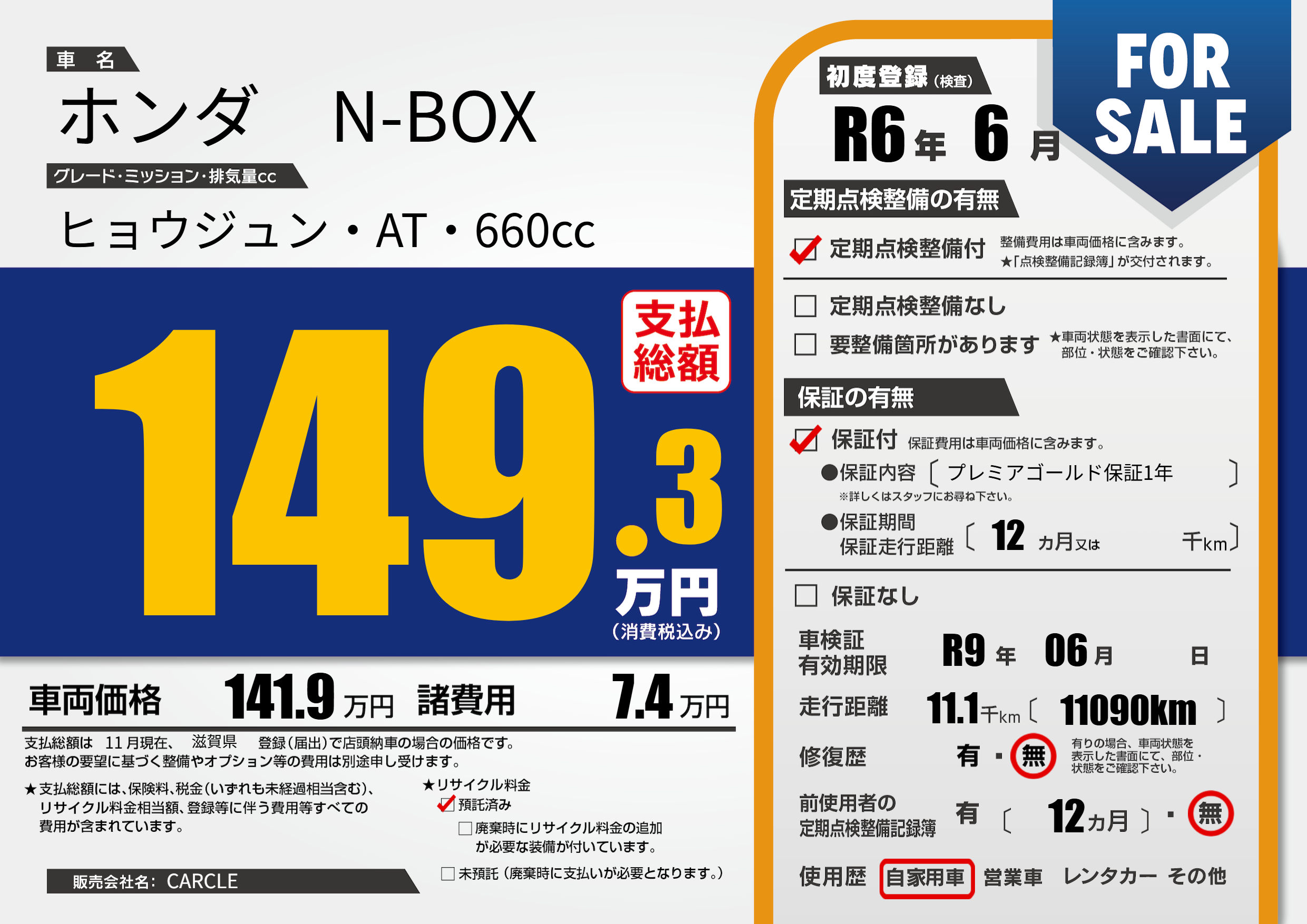 | 走行キロ | 1.1万km | 初年度登録 | R6年6月 |