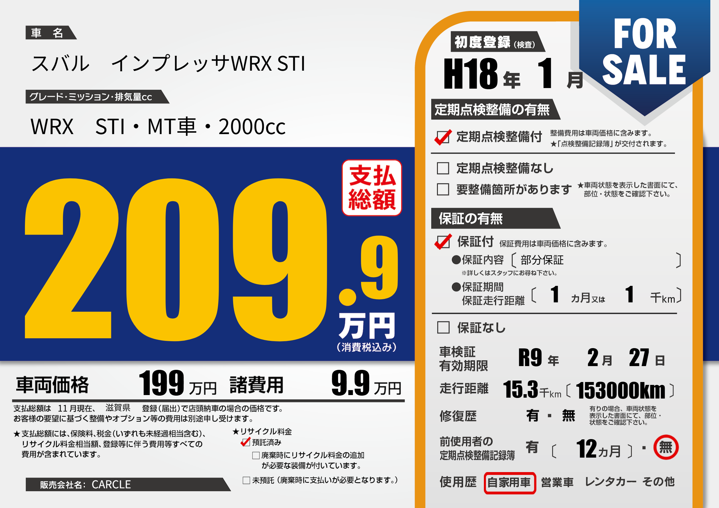 | 車名 | スバル インプレッサWRX STI | グレード ミッション 排気量 |