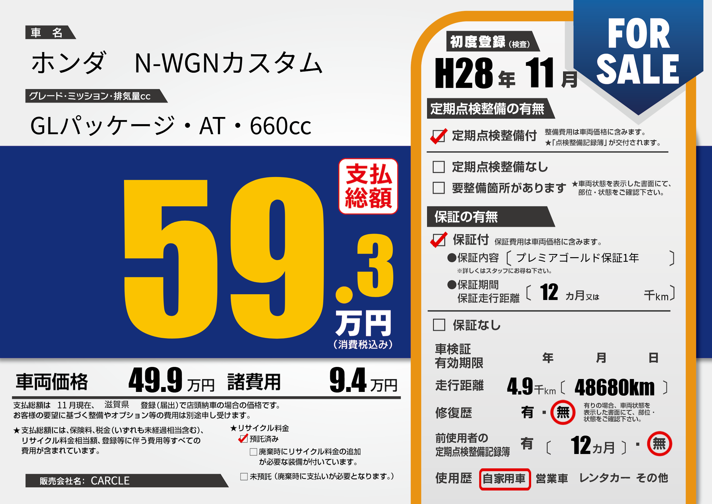 | 車名 | ホンダ N-WGNカスタム | グレード ミッション 排気量 |