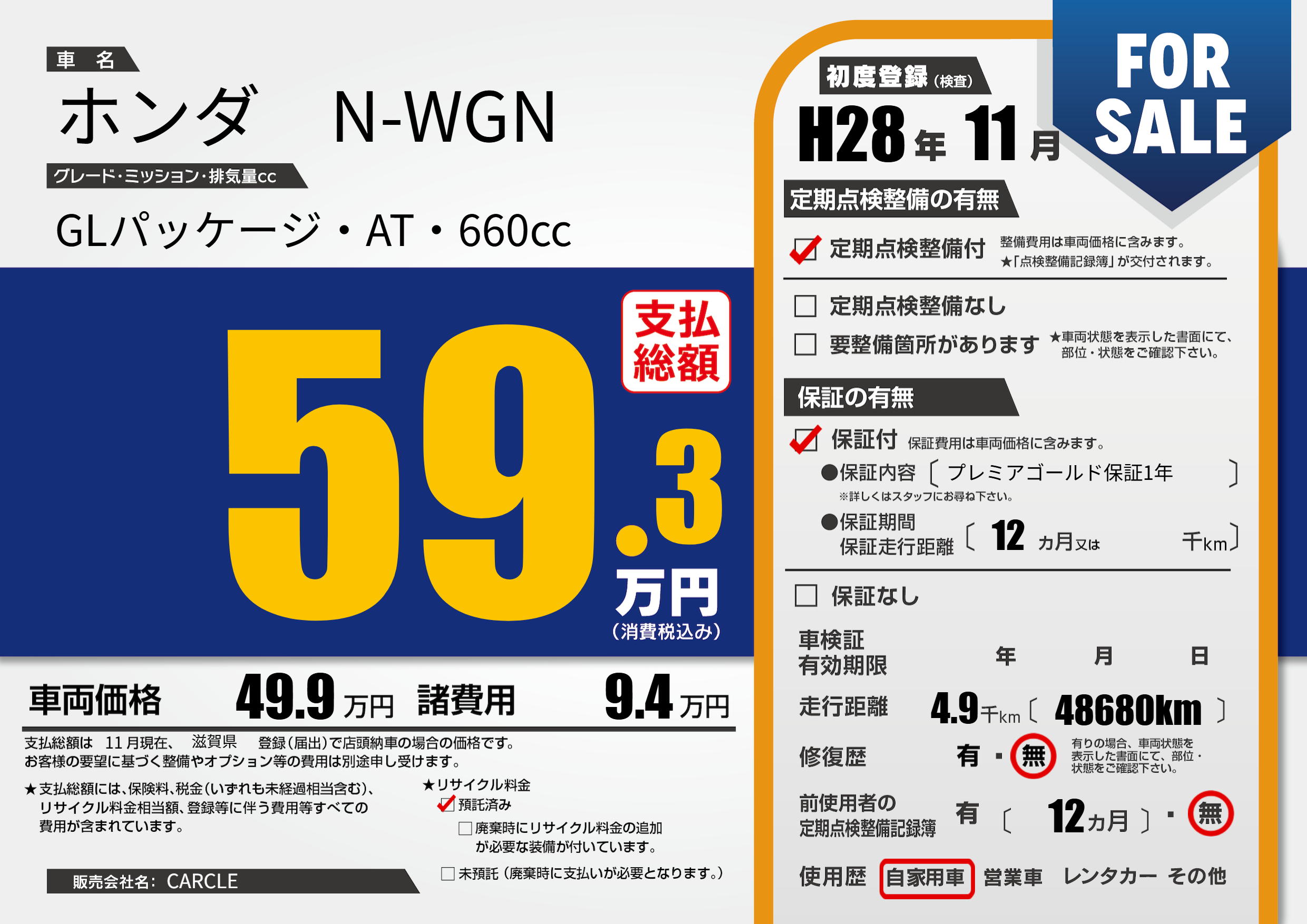 | 車名 | ホンダ N-WGN | グレード ミッション 排気量 |