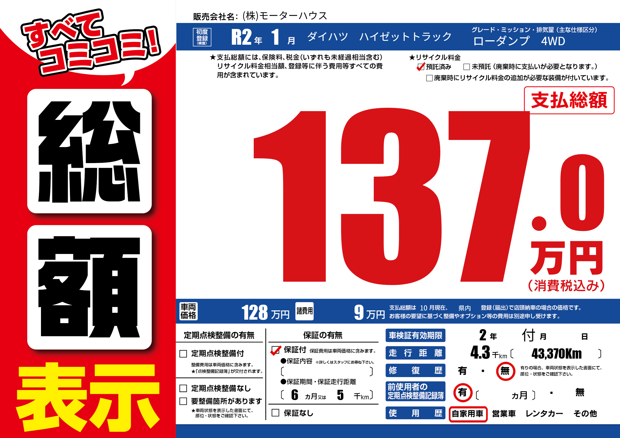 | 走行キロ | 0.4万km | 初年度登録 | R2年1月 |