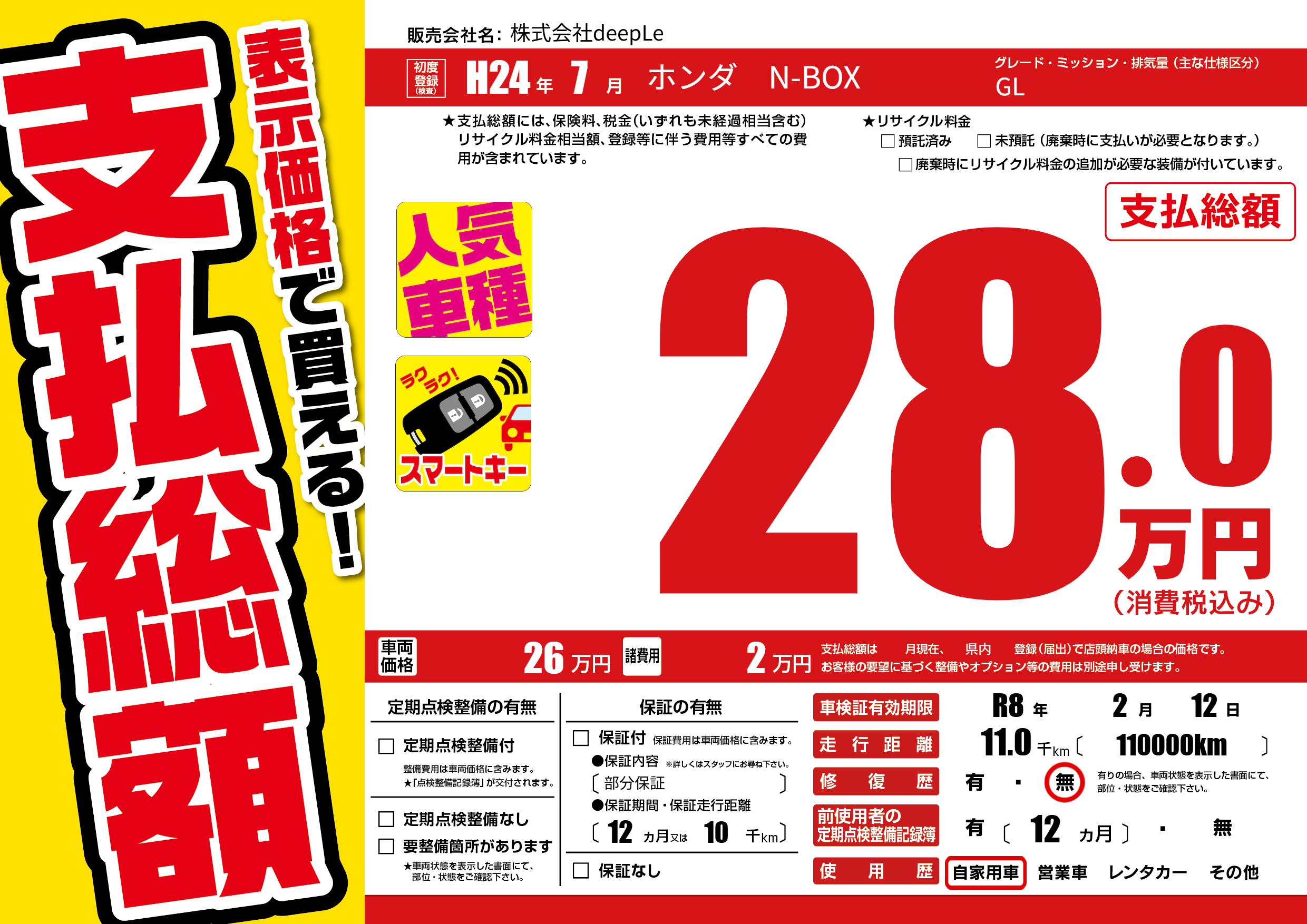 | 走行キロ | 1.1万km | 初年度登録 | H24年7月 |