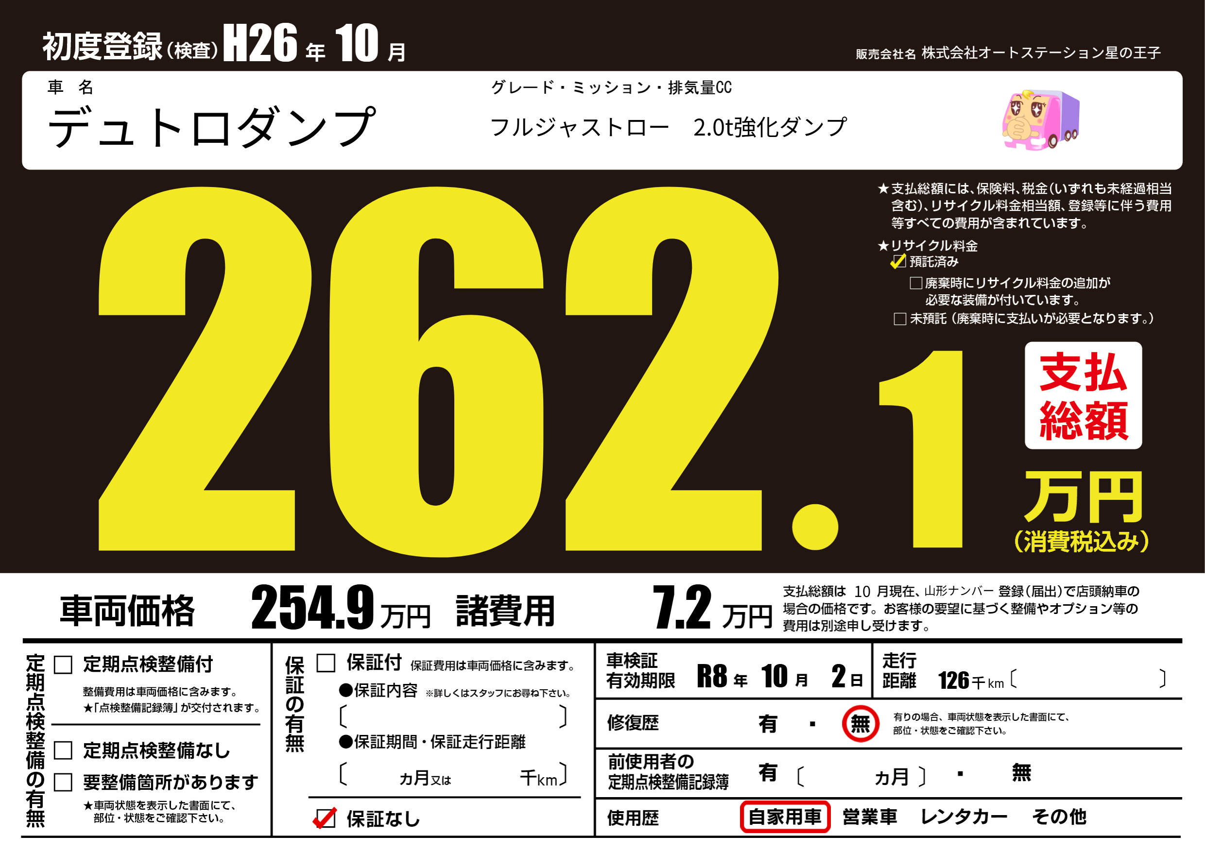 | 走行キロ | 12.6万km | 初年度登録 | H26年10月 |