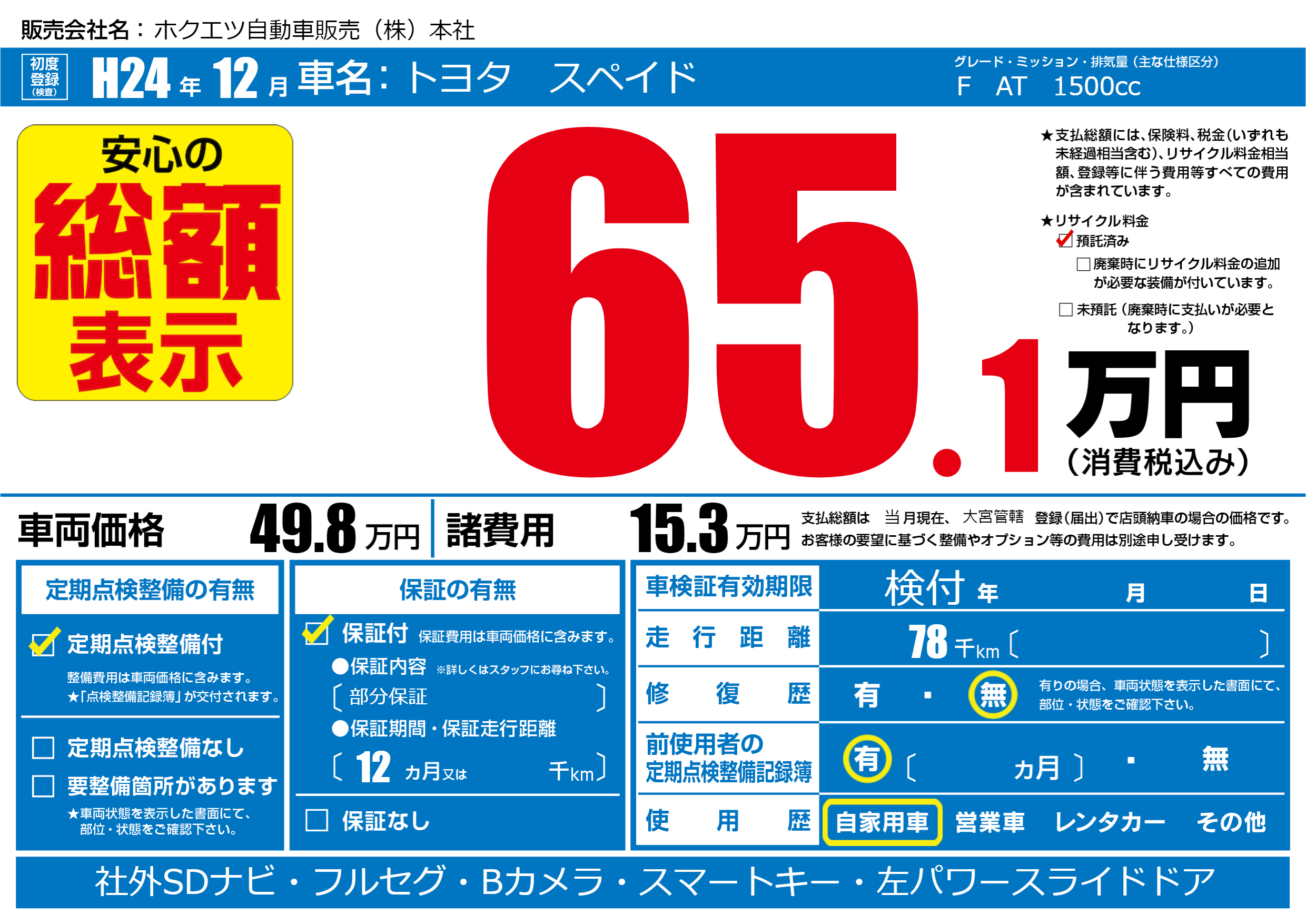 | 車名 | トヨタ スペイド | グレード ミッション 排気量 |