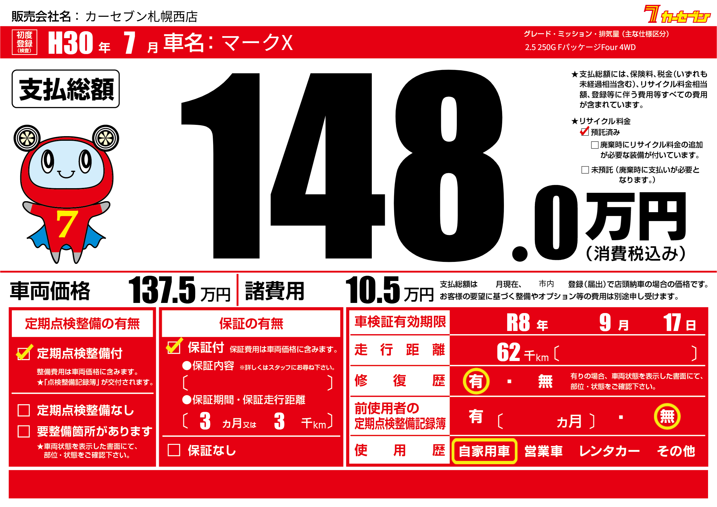 | 車検制限 | R8年 9月 17日 | ||