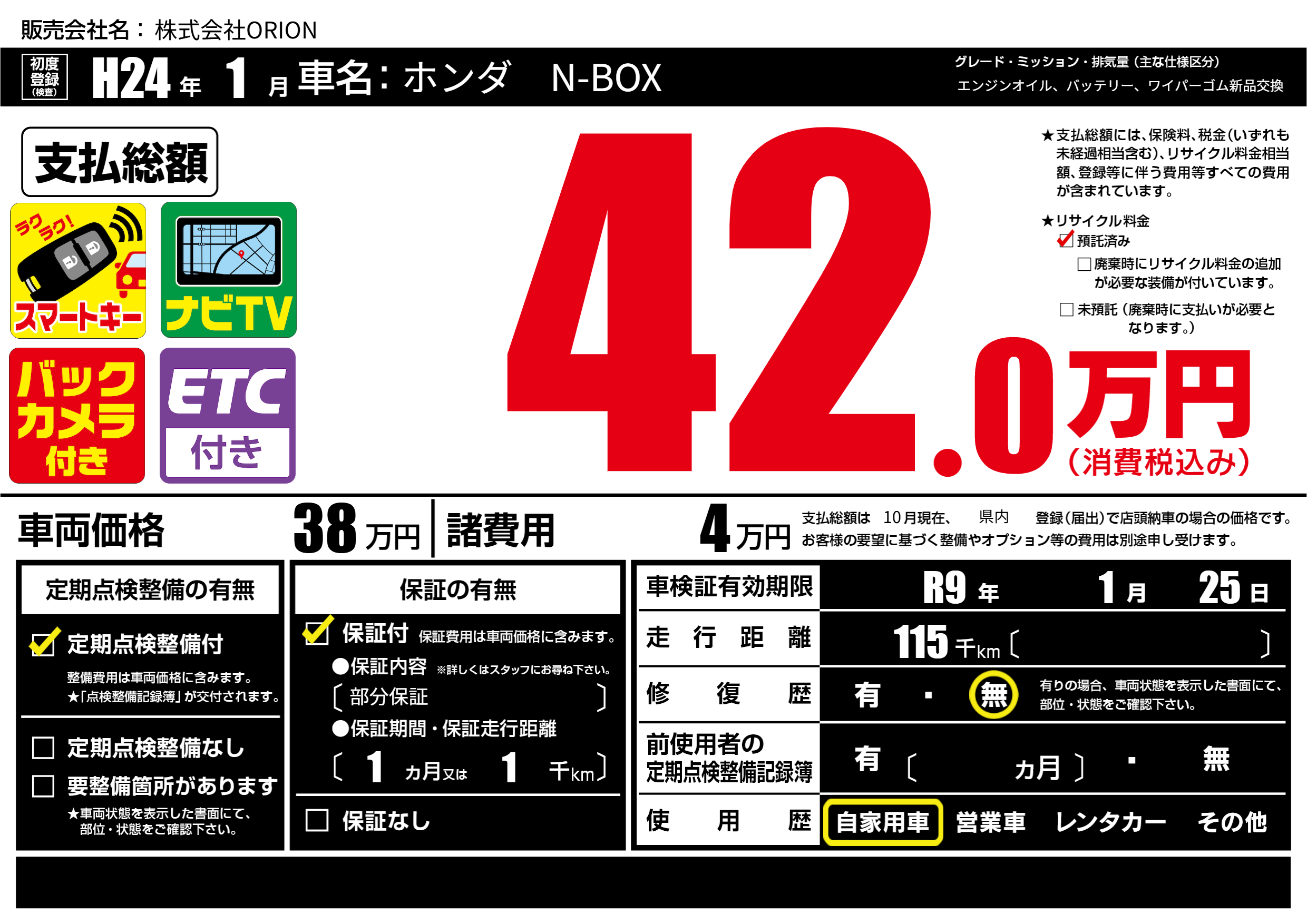 | 車名 | ホンダ N-BOX | グレード ミッション 排気量 |