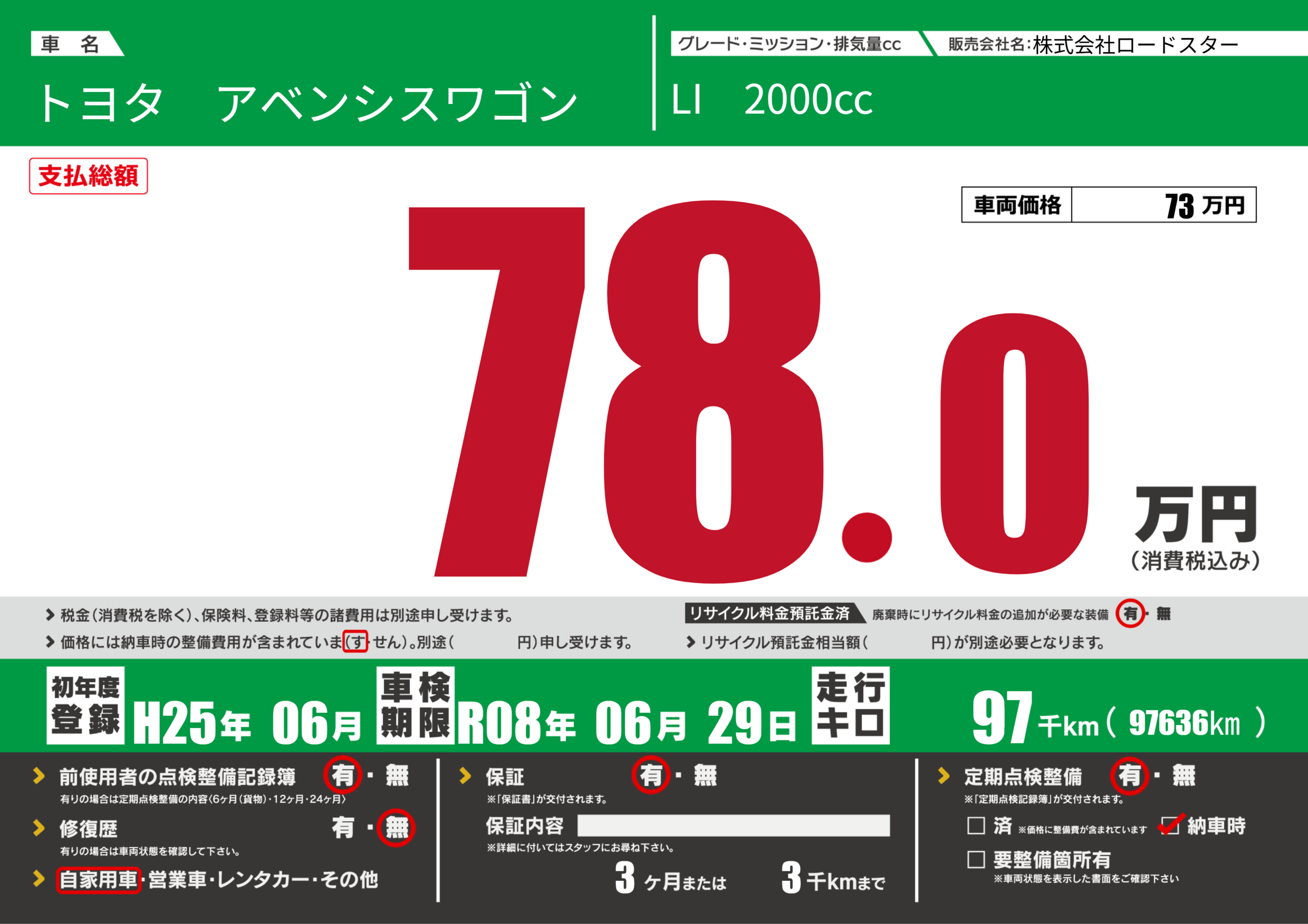| 車名 | トヨタ アベンシスワゴン | グレード ミッション 排気量 |